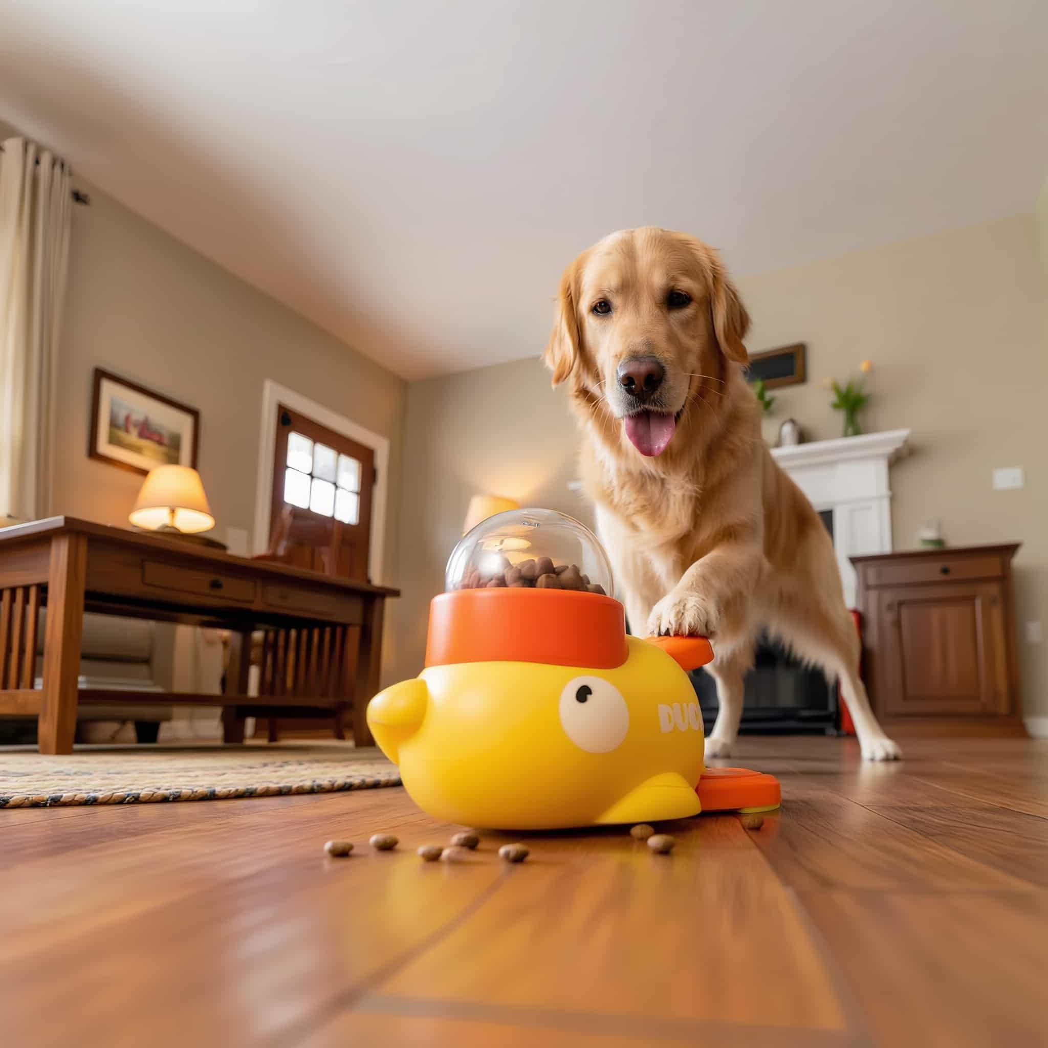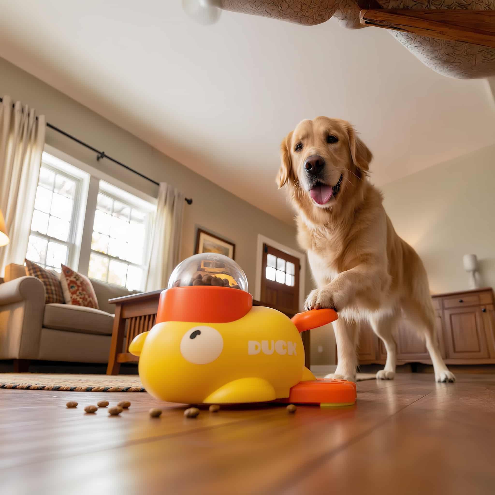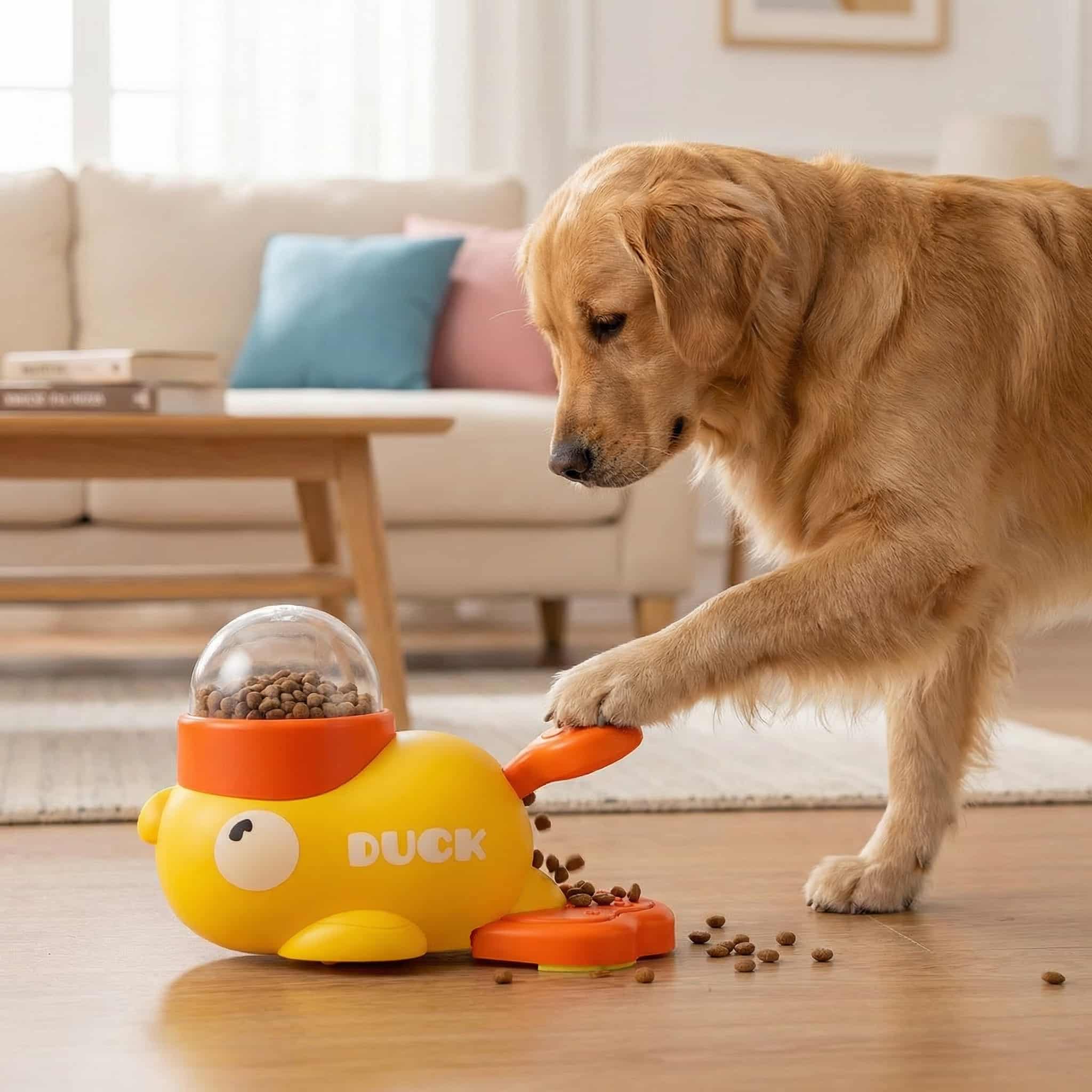 A duck-shaped puzzle feeder with press-activated buttons that dispense kibble one piece at a time, extending fast eaters’ meals from 2 to 15 minutes and preventing vomiting and bloat. Multi-step cognitive challenge reduces destructive boredom behaviors like furniture chewing and excessive barking. Battery-free mechanical design operates silently without motors. Three adjustable outlet sizes fit training treats through large breed kibble. Snap-apart dishwasher-safe components prevent bacterial buildup. Anti-slip base prevents floor sliding. Chew-resistant ABS, non-toxic materials. Suitable for small dogs through 50 lbs, works for cats.