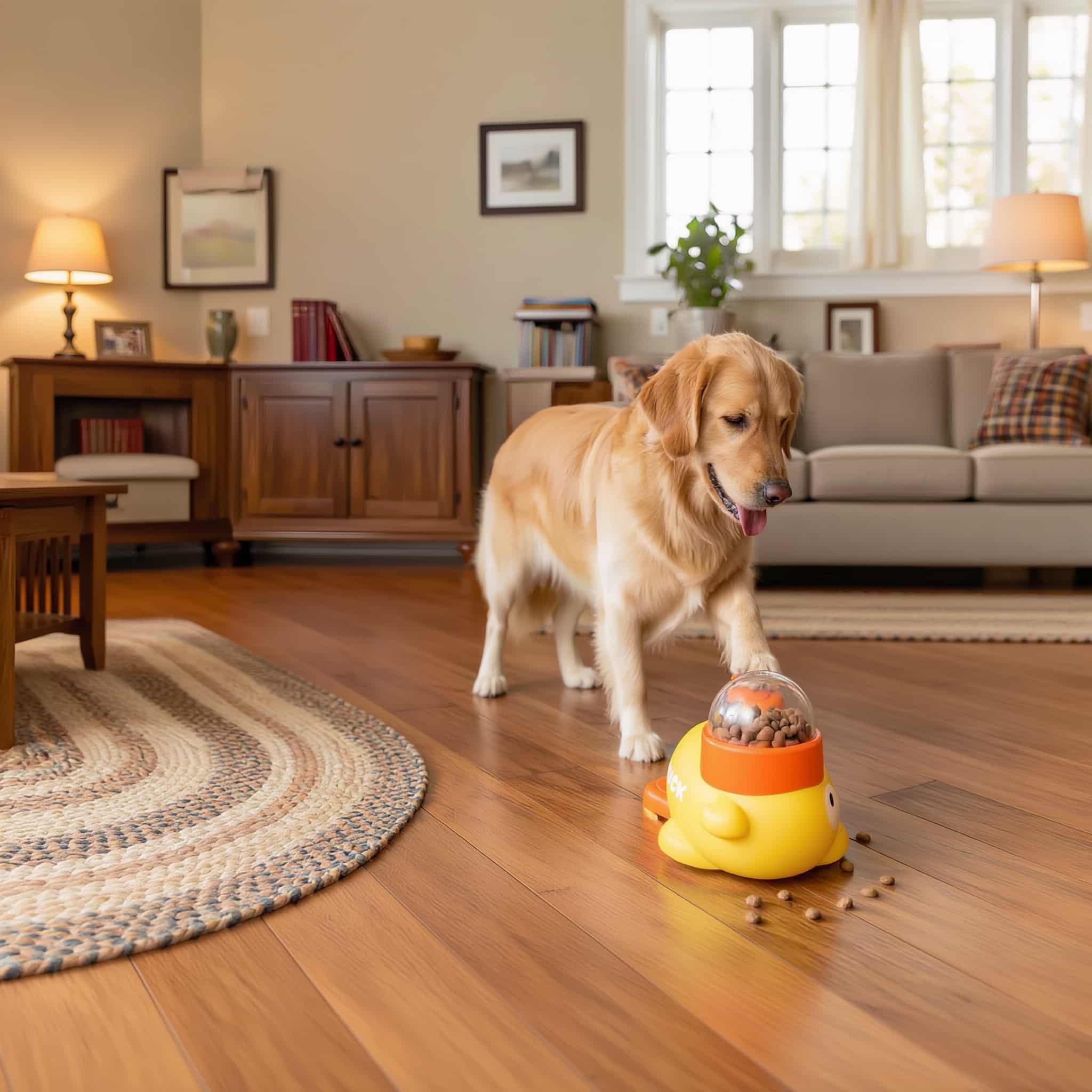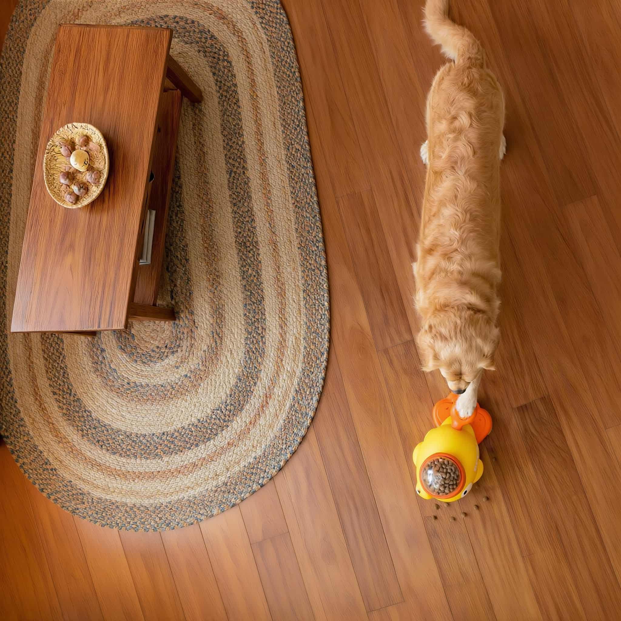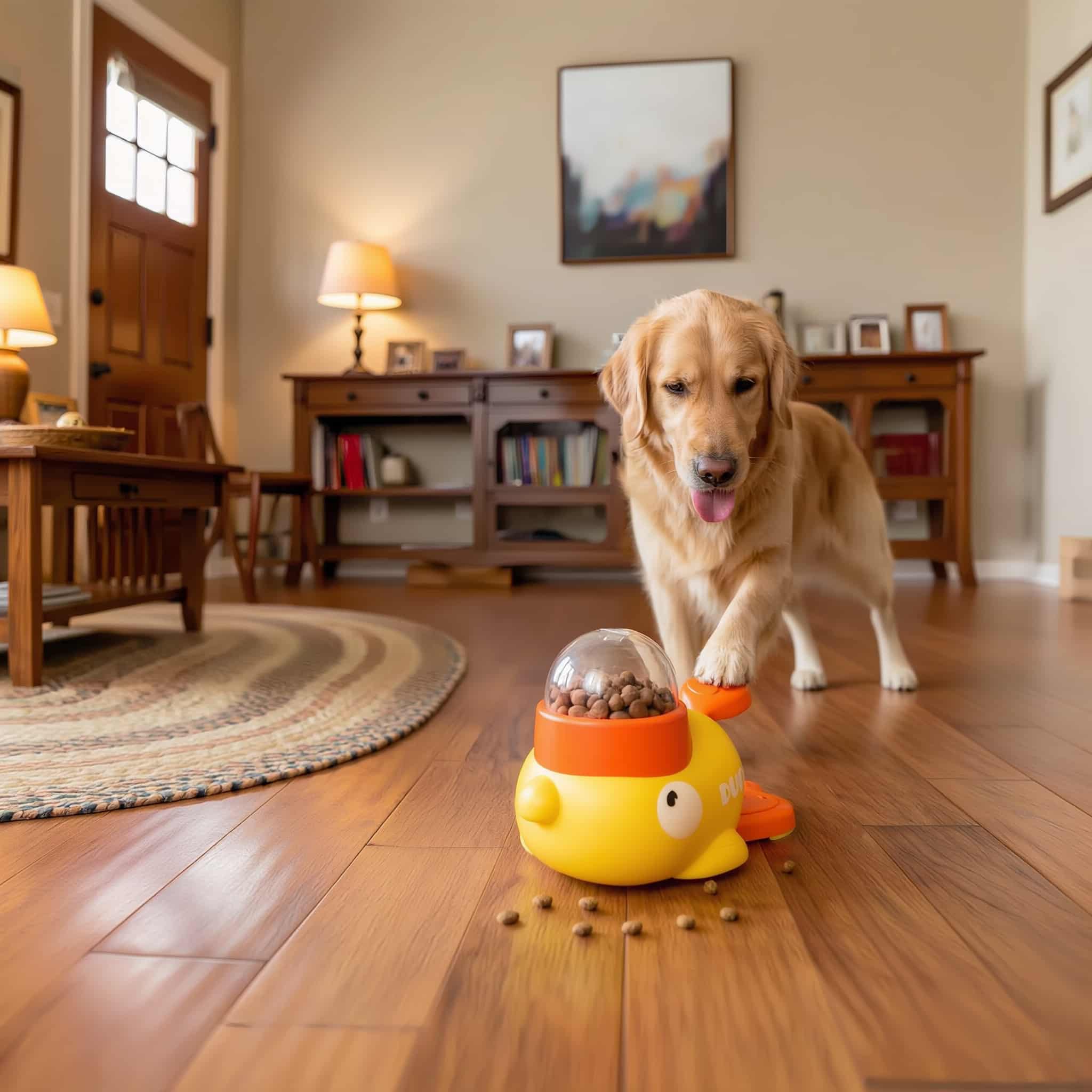 A duck-shaped puzzle feeder with press-activated buttons that dispense kibble one piece at a time, extending fast eaters’ meals from 2 to 15 minutes and preventing vomiting and bloat. Multi-step cognitive challenge reduces destructive boredom behaviors like furniture chewing and excessive barking. Battery-free mechanical design operates silently without motors. Three adjustable outlet sizes fit training treats through large breed kibble. Snap-apart dishwasher-safe components prevent bacterial buildup. Anti-slip base prevents floor sliding. Chew-resistant ABS, non-toxic materials. Suitable for small dogs through 50 lbs, works for cats.