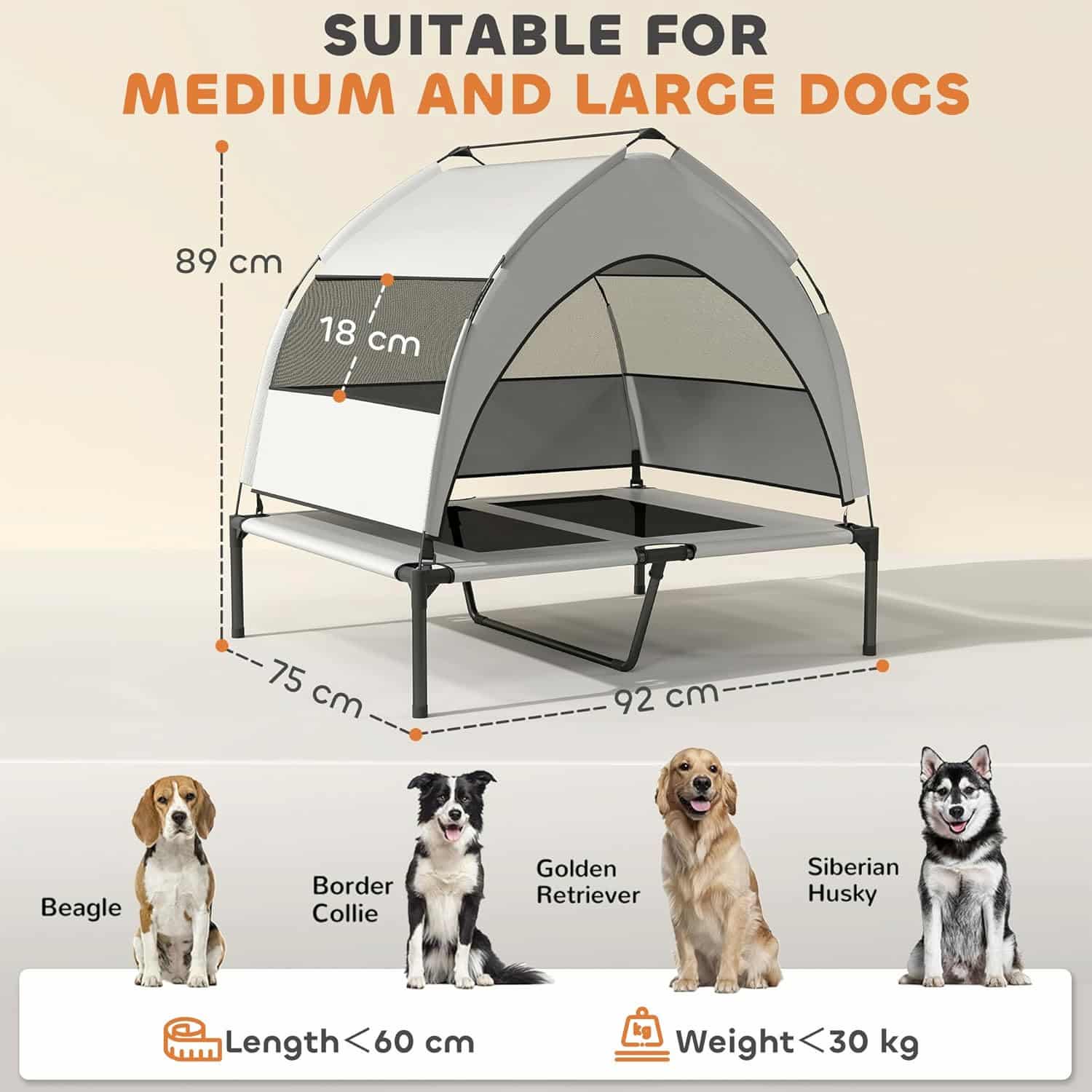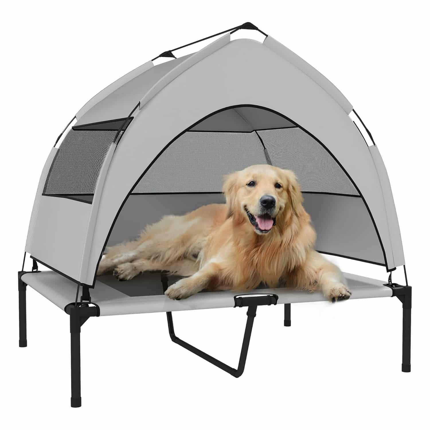 Two central textilene mesh panels let air circulate underneath and around your dog, keeping them cooler than foam beds. Mesh windows on canopy sides create cross-breeze. Raised 8" off ground prevents dampness from grass or concrete from reaching dog.