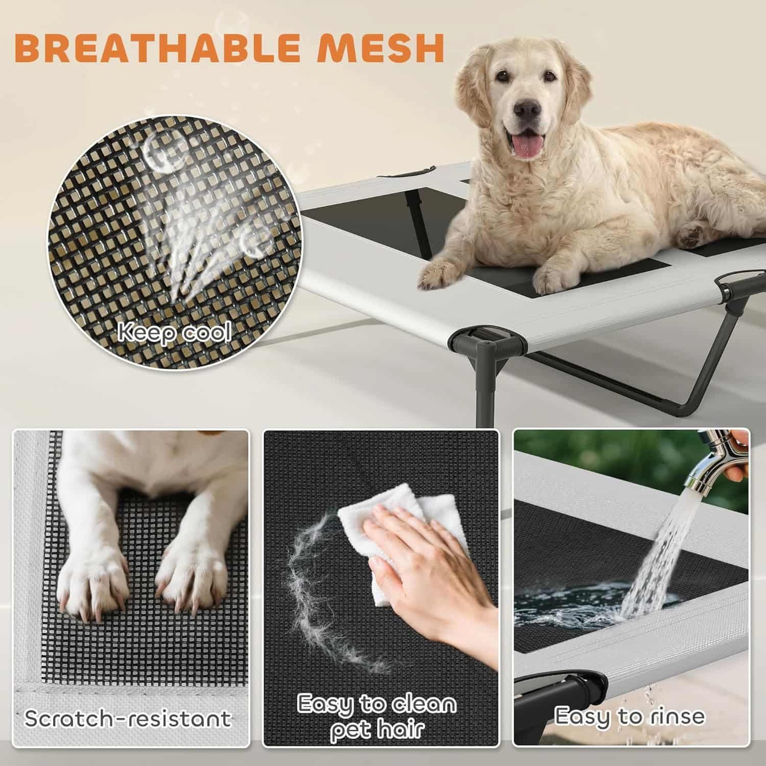 Elevated design keeps fur off ground, reducing mud and debris transfer. Mesh surface dries quickly after rain or hosing. Non-slip rubber feet prevent sliding on tile or wood floors. Remove canopy for indoor use in garages or basements during hot weather.