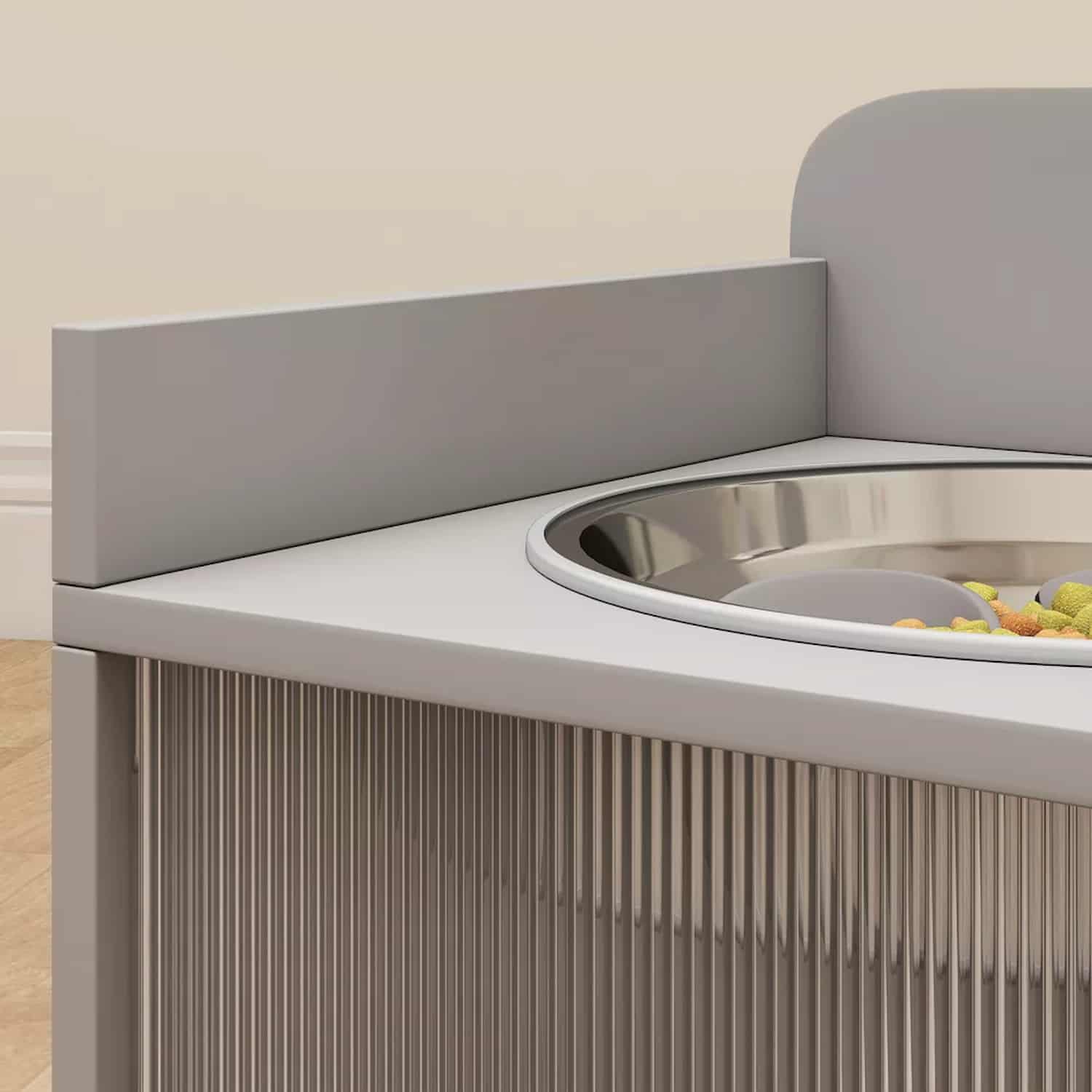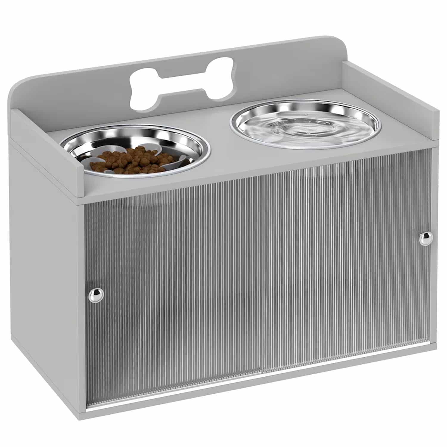 Double-door compartment with semi-transparent acrylic panels conceals dog food bags and supplies. Keeps feeding area organized without separate storage furniture. Bone-shaped cutouts add decorative detail. Gray finish with fluted texture blends with home decor.