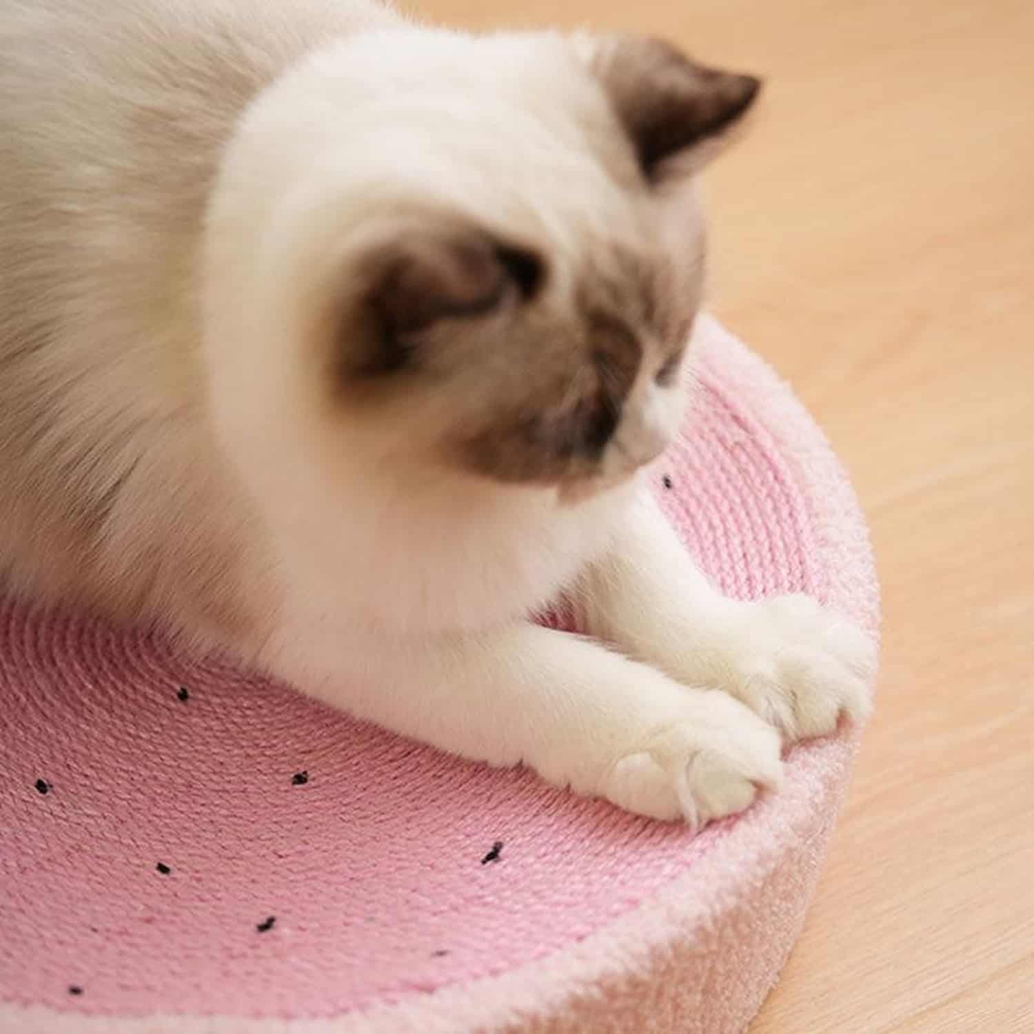 The raised rim is soft and padded, giving cats a cushioned edge to rest their head on or press against while sleeping. The contrast between the firm sisal center and the soft outer rim gives cats two textures in one piece, satisfying both scratching and comfort needs.
