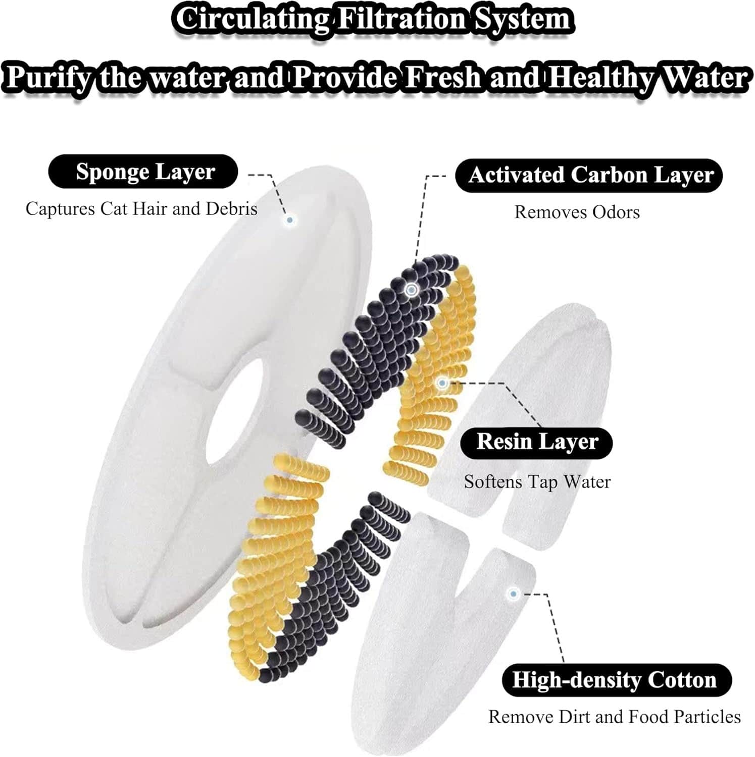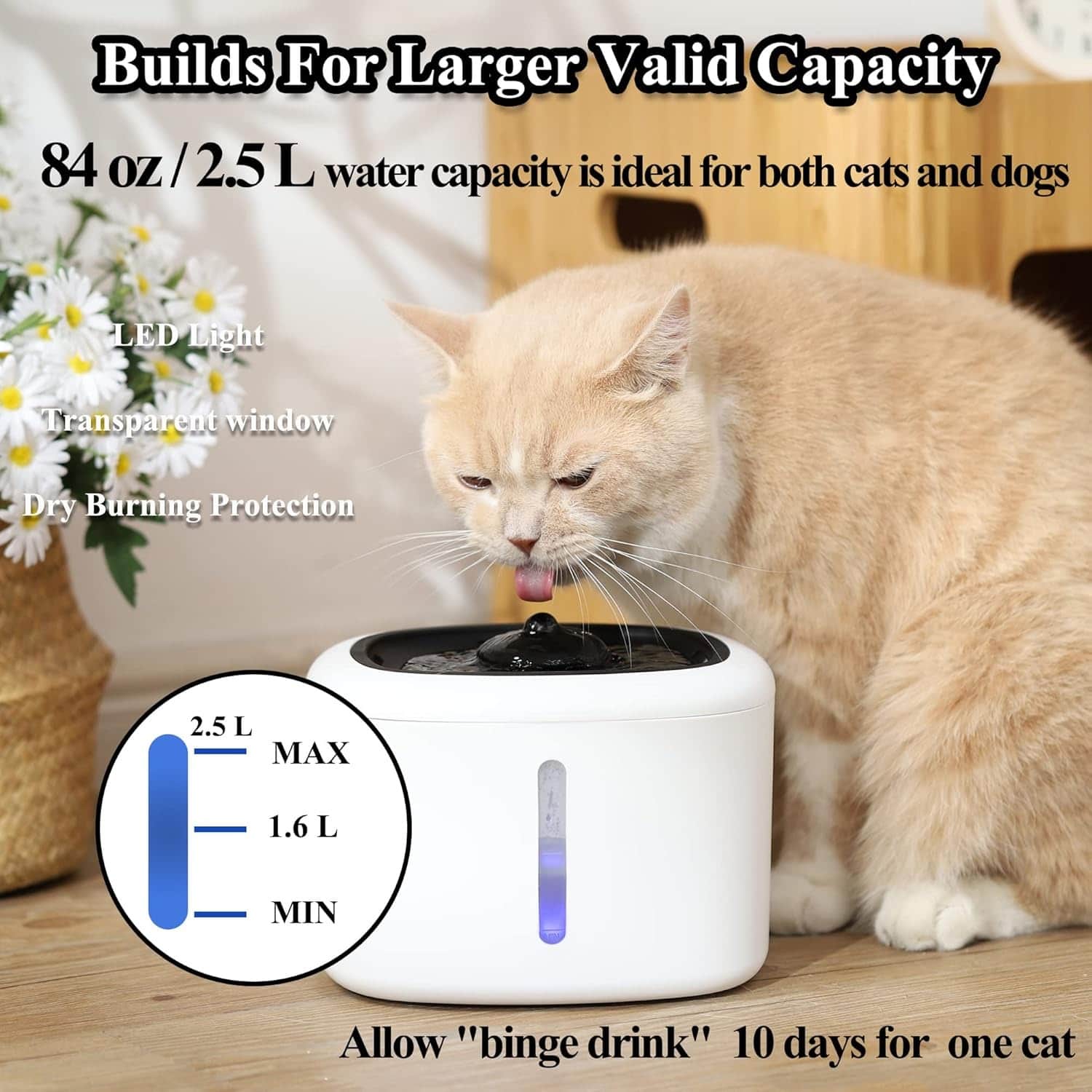 An 84oz fountain with LED indicator that glows blue when refills are needed and auto-shuts off before pump burns out, preventing $40-60 replacement costs. Four-layer filtration removes fur, food debris, chlorine, and heavy metals like lead. Sub-25dB pump operates silently during video calls and sleep. 2.5-liter capacity lasts single cats 7-10 days, multi-pet homes 3-4 days. BPA-free ABS, snap-apart dishwasher-safe design. Continuous circulation oxygenates water, attracts cats who ignore stagnant bowls.