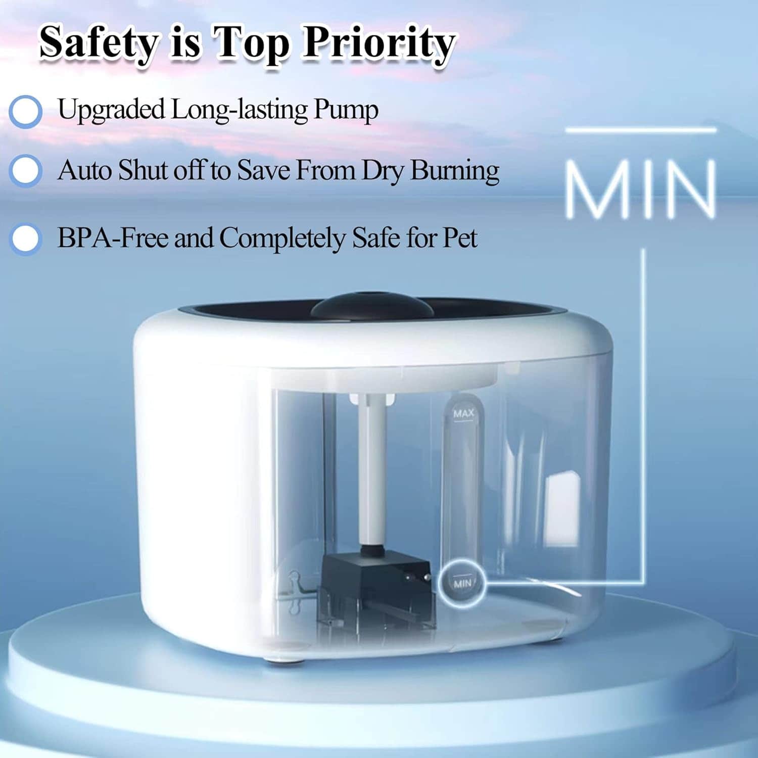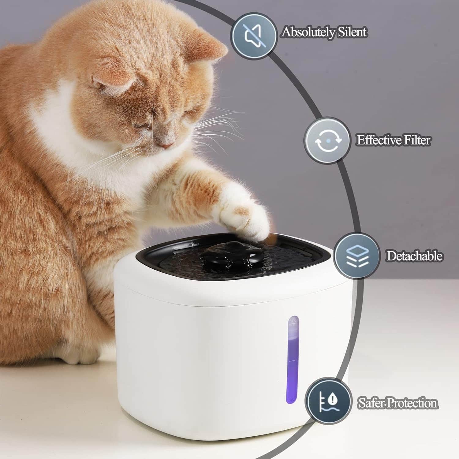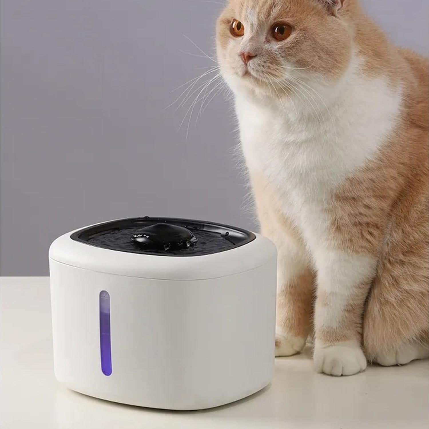 LED fountain that illuminates blue when water runs low and auto-shuts off to prevent pump burnout, while quadruple filtration removes fur, chlorine, and heavy metals.