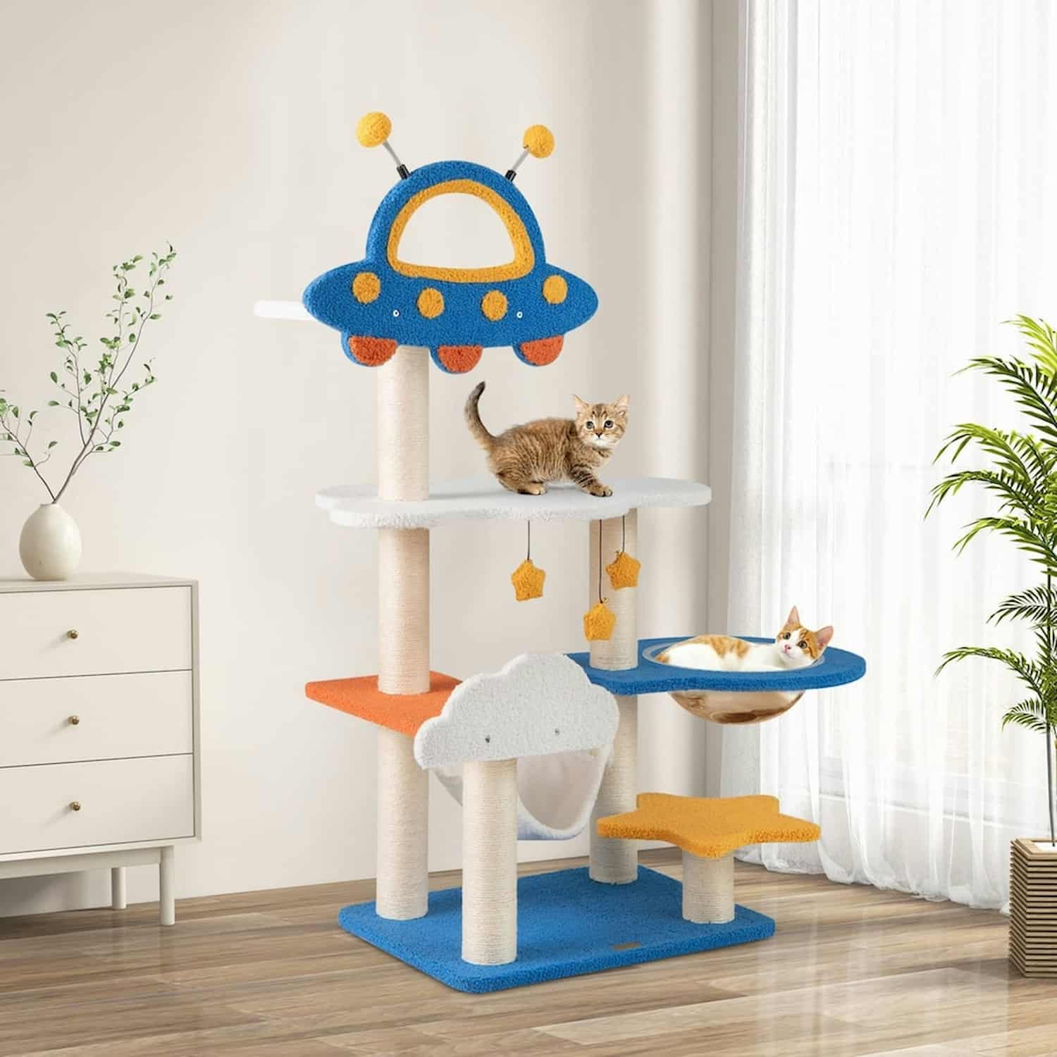Space-themed cat tree with a transparent capsule enclosure, UFO top perch, hammock, cloud and star platforms.
