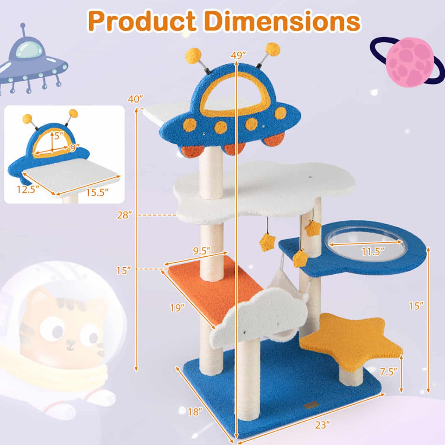 A 49-inch 7-level space-themed cat tree with a transparent mid-height capsule enclosure, UFO-shaped top perch, fabric swinging hammock, cloud-shaped wide platform, and star-shaped step platform. Natural sisal wraps all posts full-length. Five bell toys included: three dangling star balls and two spring-mounted balls. Teddy plush fabric on all platforms. Overall dimensions 23 by 18 by 49 inches. Wide plush base, no wall anchoring required. Suits multi-cat households.
