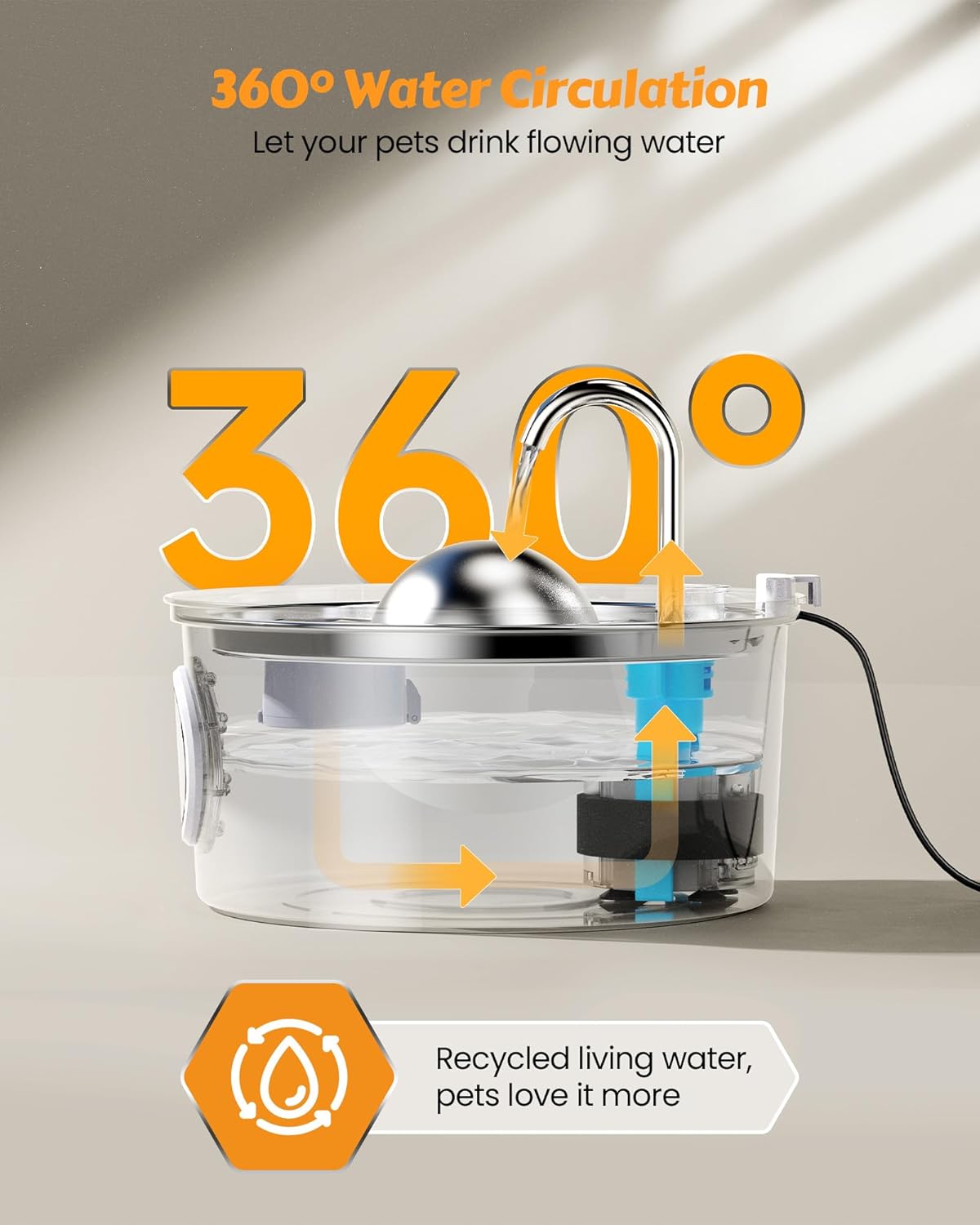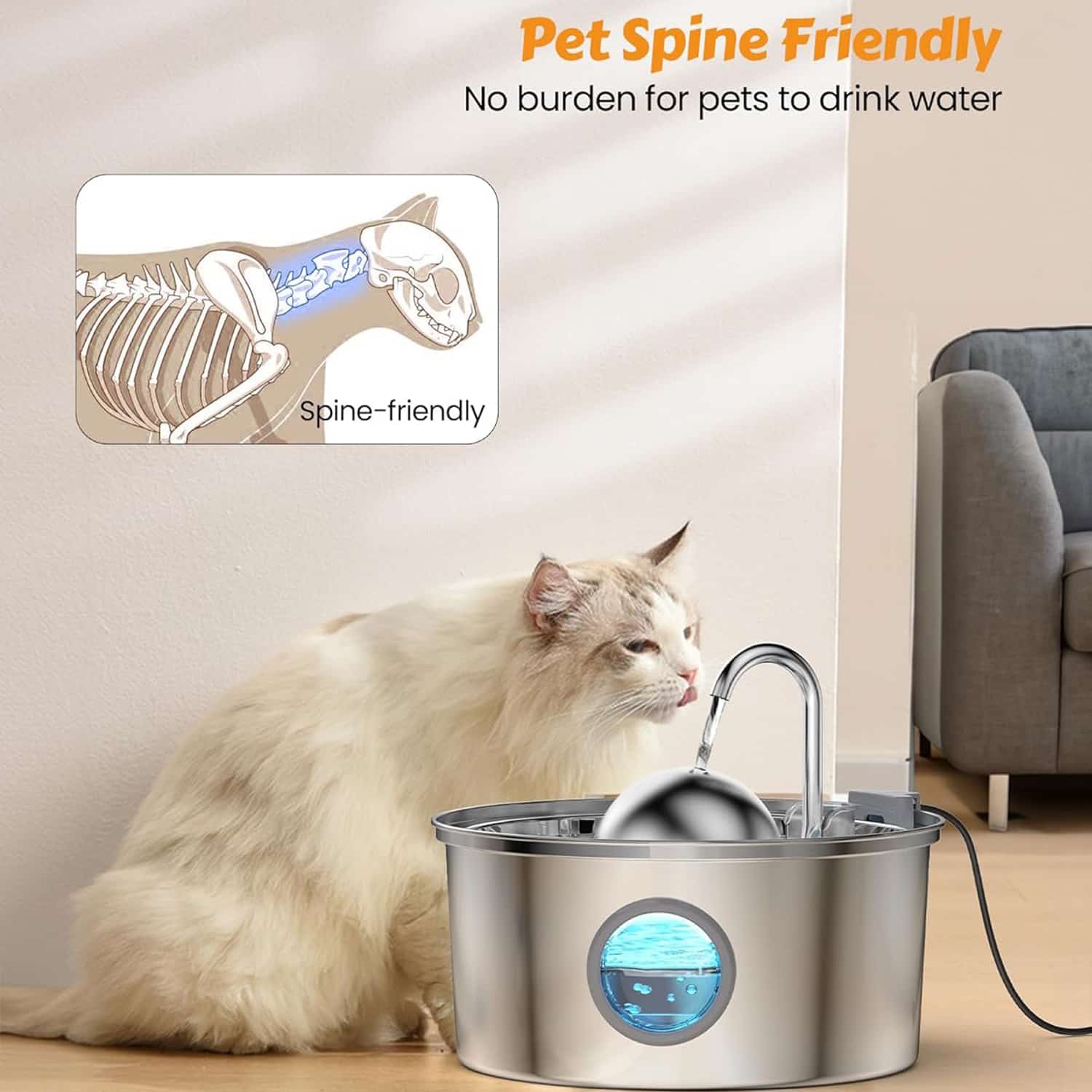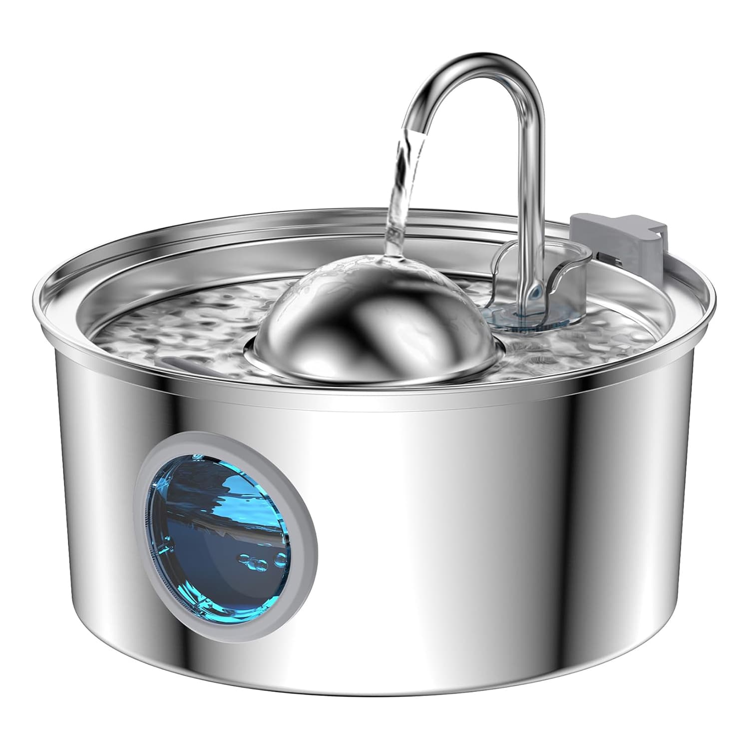 Stainless steel fountain with faucet-style stream that triggers cats’ instinct to drink from moving water, increasing daily hydration and reducing kidney disease risk. 4-layer filtration (pre-filter sponge, PP cotton, activated carbon, ion exchange resin) removes hair, debris, odors, and hard minerals that cause urinary stones. SUS304 steel resists scratches that harbor bacteria in plastic fountains, preventing chin acne. 25dB pump quieter than plastic models, suitable for bedroom placement. 108oz capacity provides 8 days of water for single cat. Visible water level window. Dishwasher-safe bowl except window.