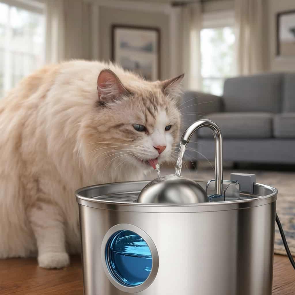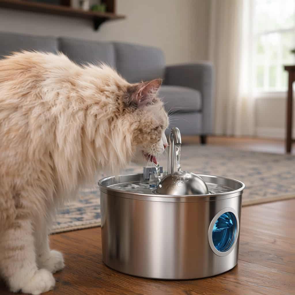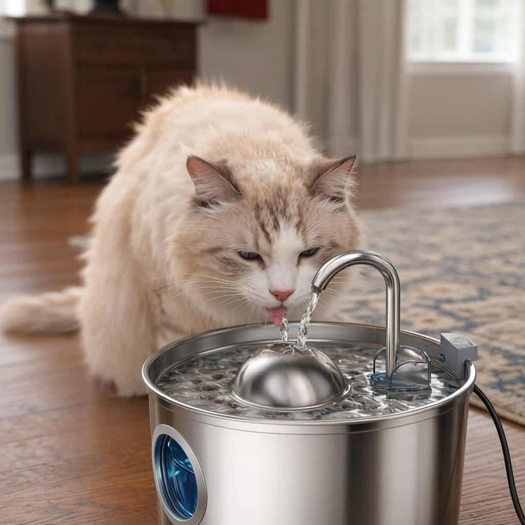 Stainless steel fountain with faucet stream that mimics natural water sources, triggering drinking instinct in cats who ignore stagnant bowls.
