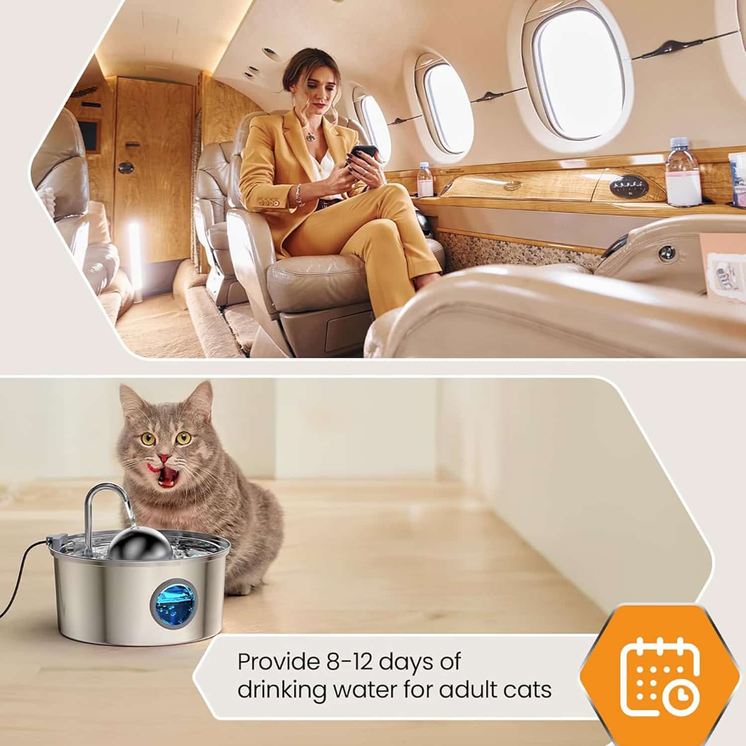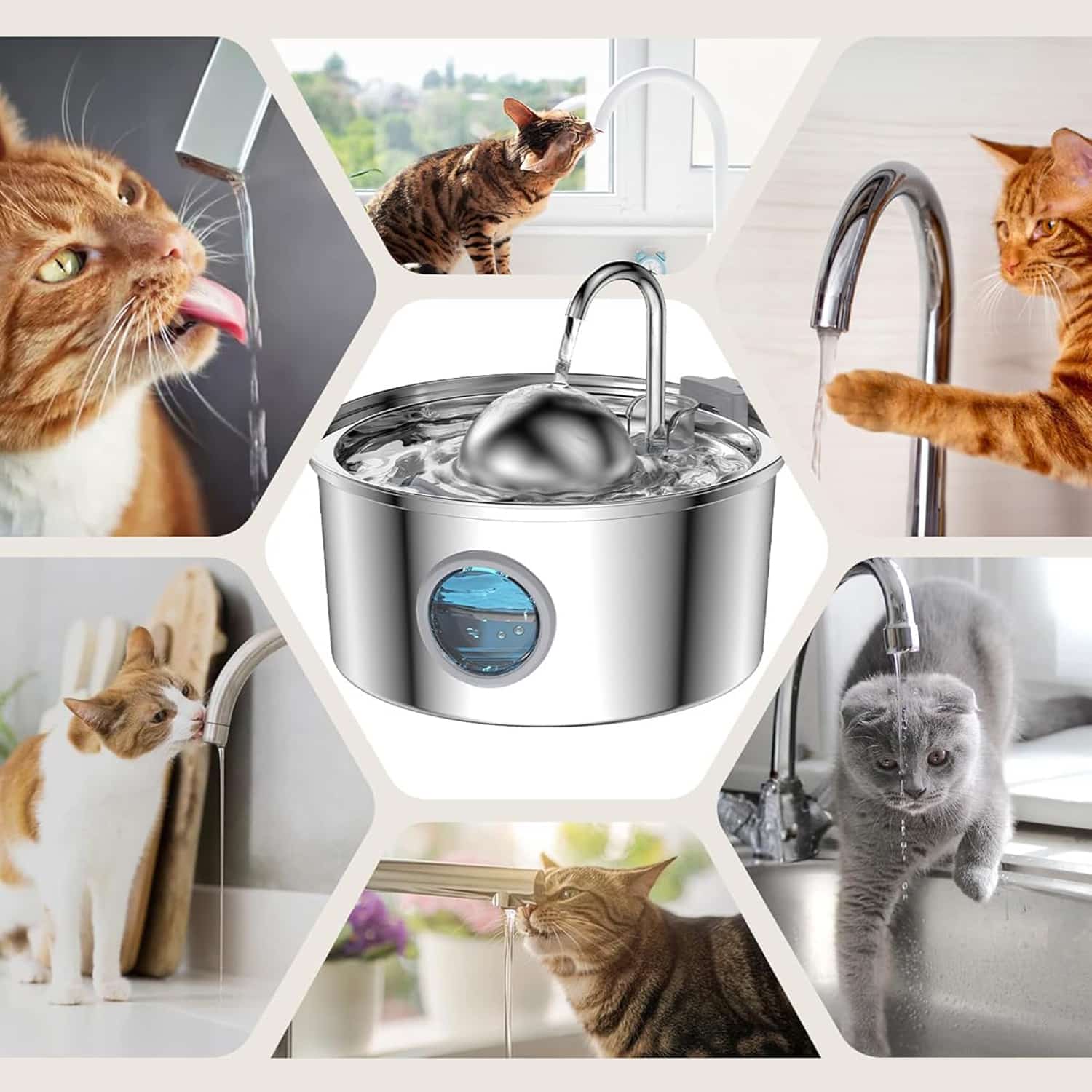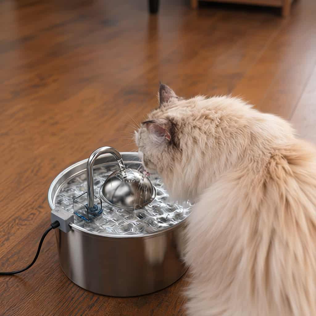Stainless steel fountain with faucet stream that mimics natural water sources, triggering drinking instinct in cats who ignore stagnant bowls.