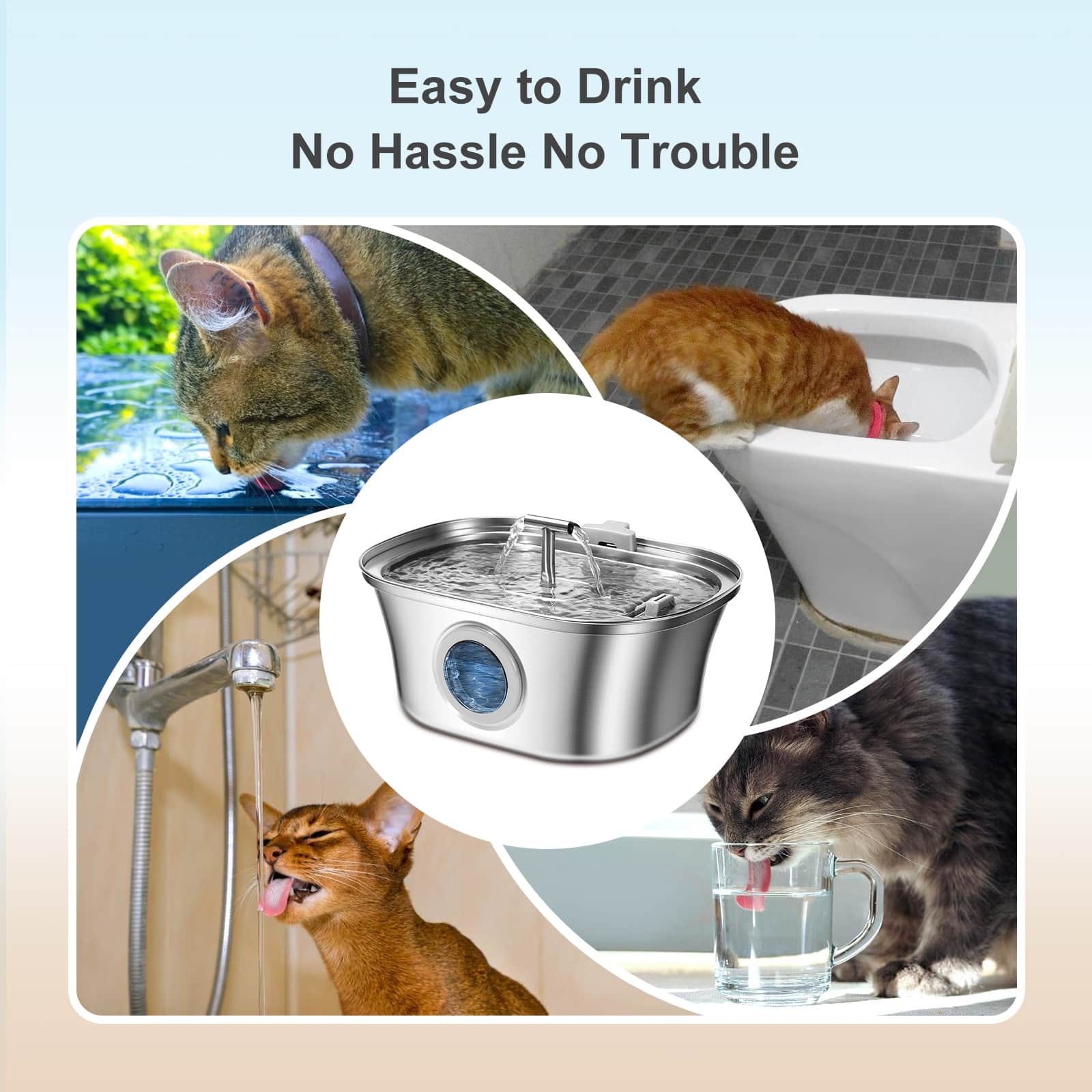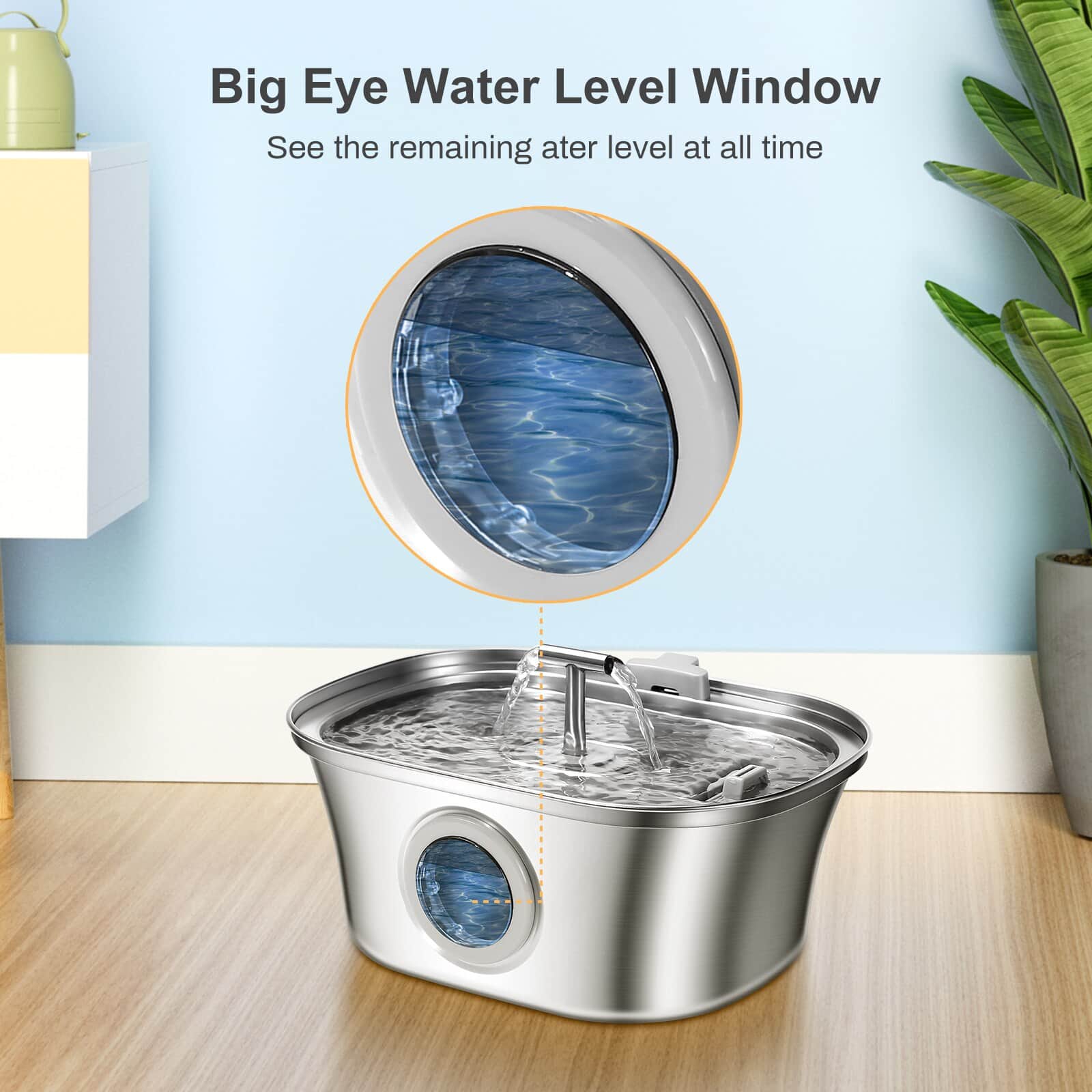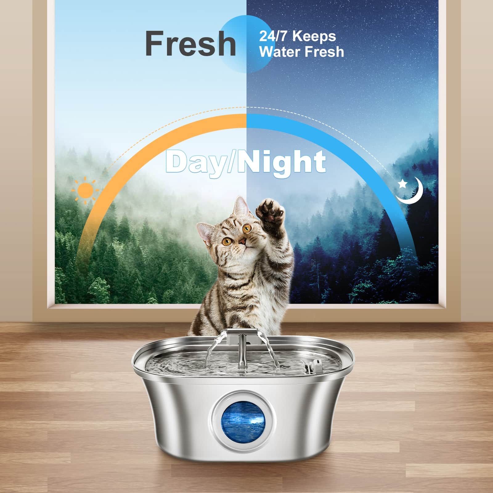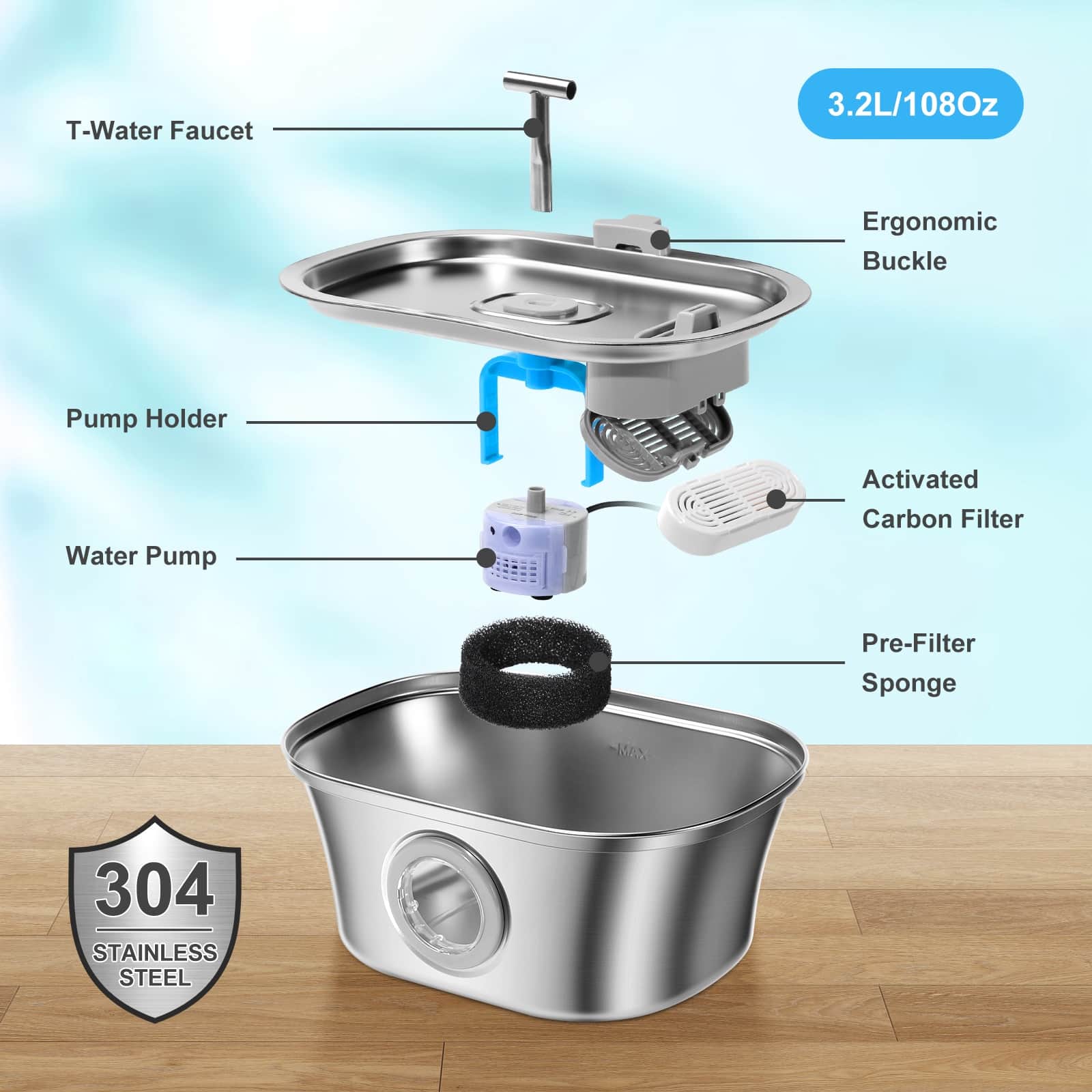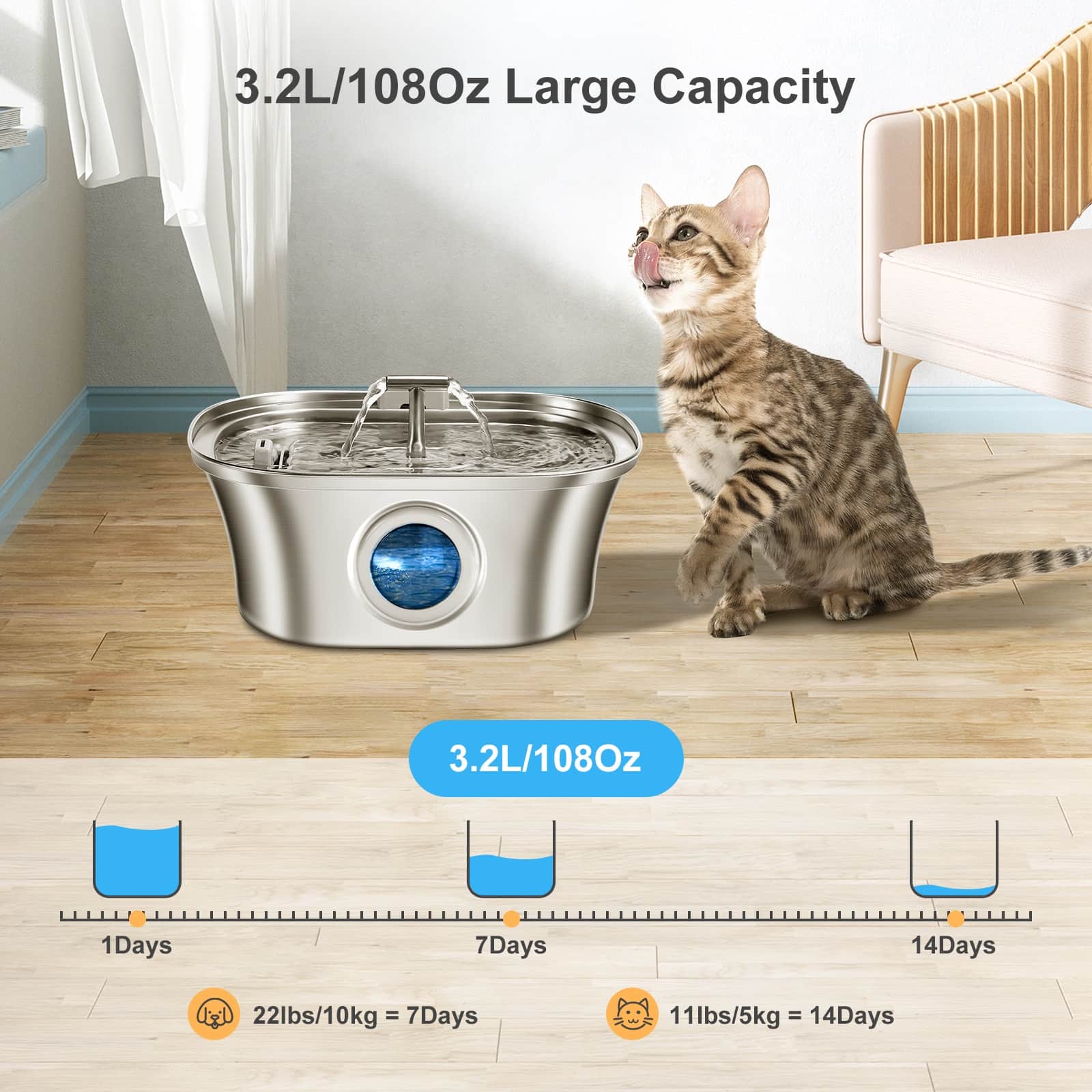 Stainless steel fountain with dual outlets that continuously circulate and aerate water, keeping it fresher than stagnant bowls. Movement attracts cats who ignore still water, increasing daily hydration to reduce kidney disease risk. 20dB ultra-quiet 1.5W pump suitable for bedroom placement without disturbing sleep. Pirate ship window lets you check water level without opening lid or interrupting drinking pets. 3.2L (108oz) capacity provides 7-14 days of water depending on pet size. 304 food-grade steel resists scratches that harbor bacteria, preventing chin acne. Corrosion-resistant, easy-clean design with removable components.