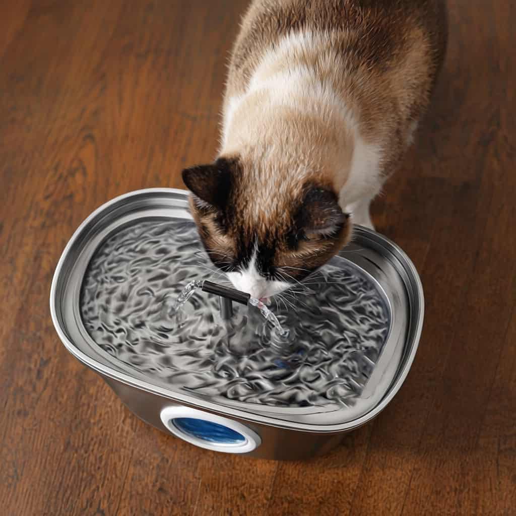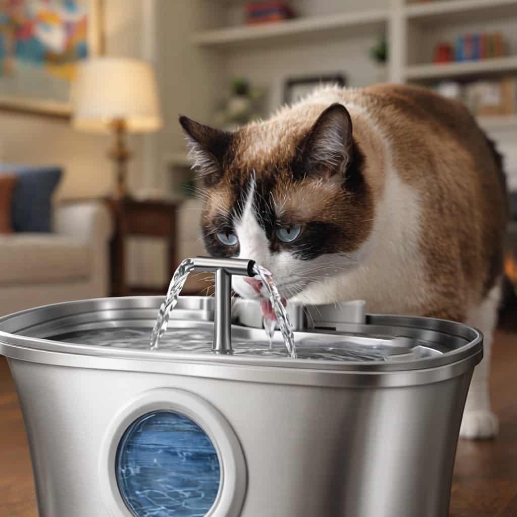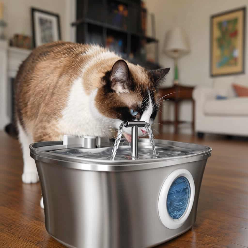 Stainless steel fountain with dual outlets that continuously aerate water, keeping it fresher longer and attracting cats who ignore stagnant bowls.