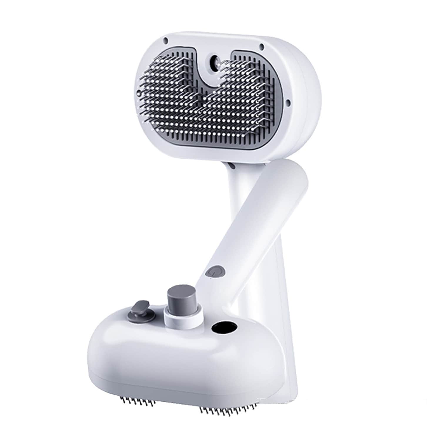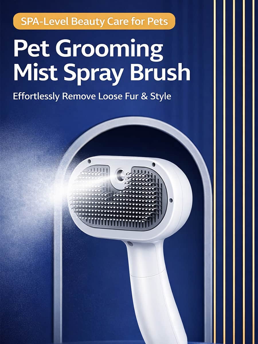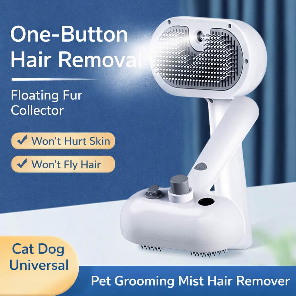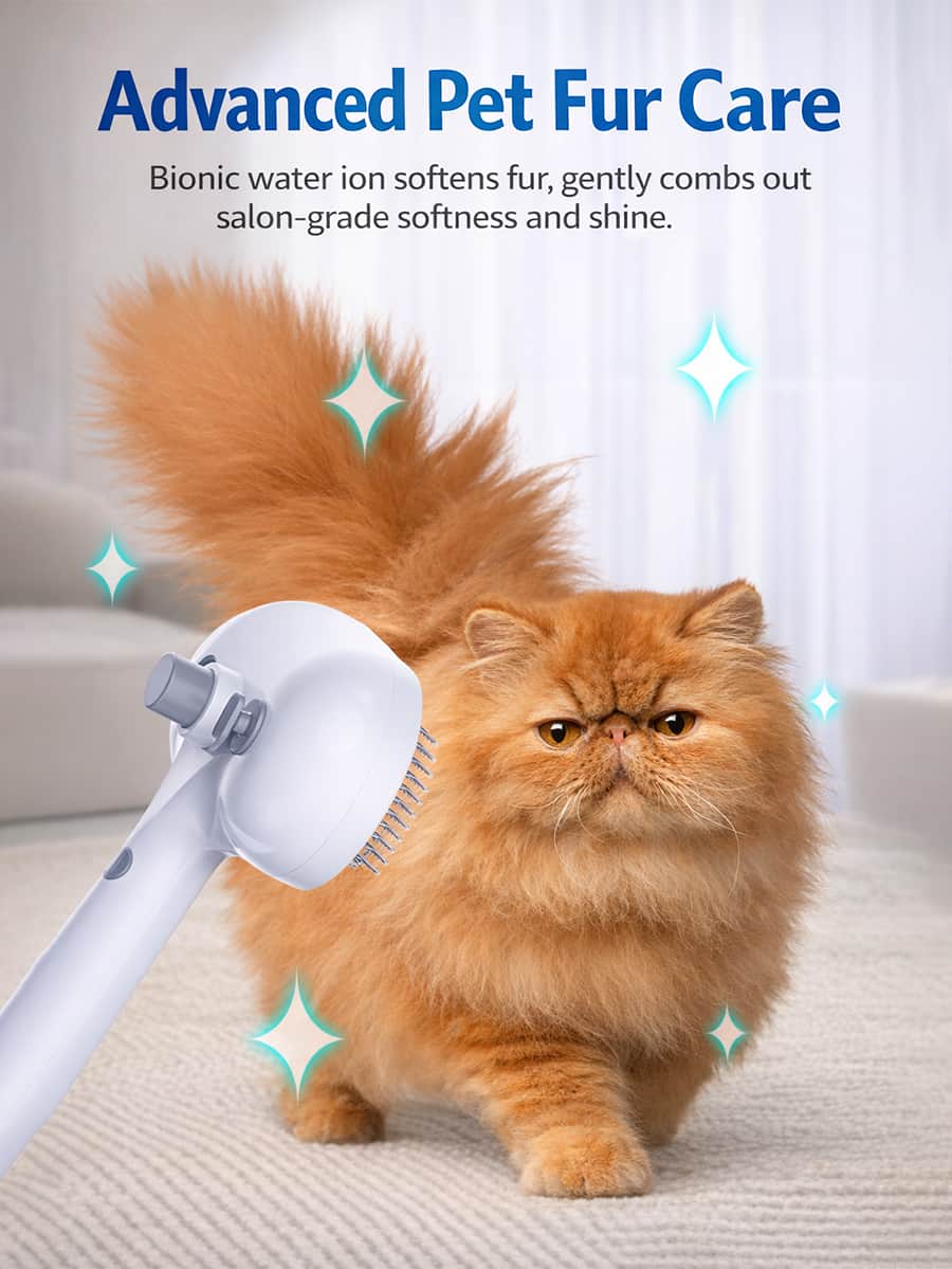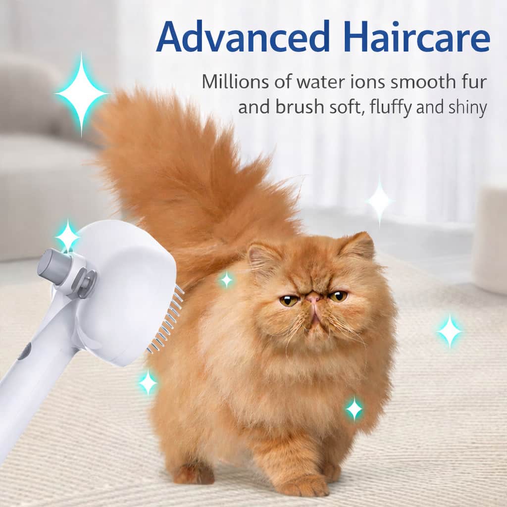Pet grooming mist steam brush (7.6×4.7″) with built-in water tank spraying fine mist with millions of water ions penetrating deep into fur, avoiding static electricity causing hair to fly everywhere during dry brushing. Advanced haircare system smooths fur, creates soft fluffy shiny coats while removing loose undercoat, moisturizes skin and reduces irritation.