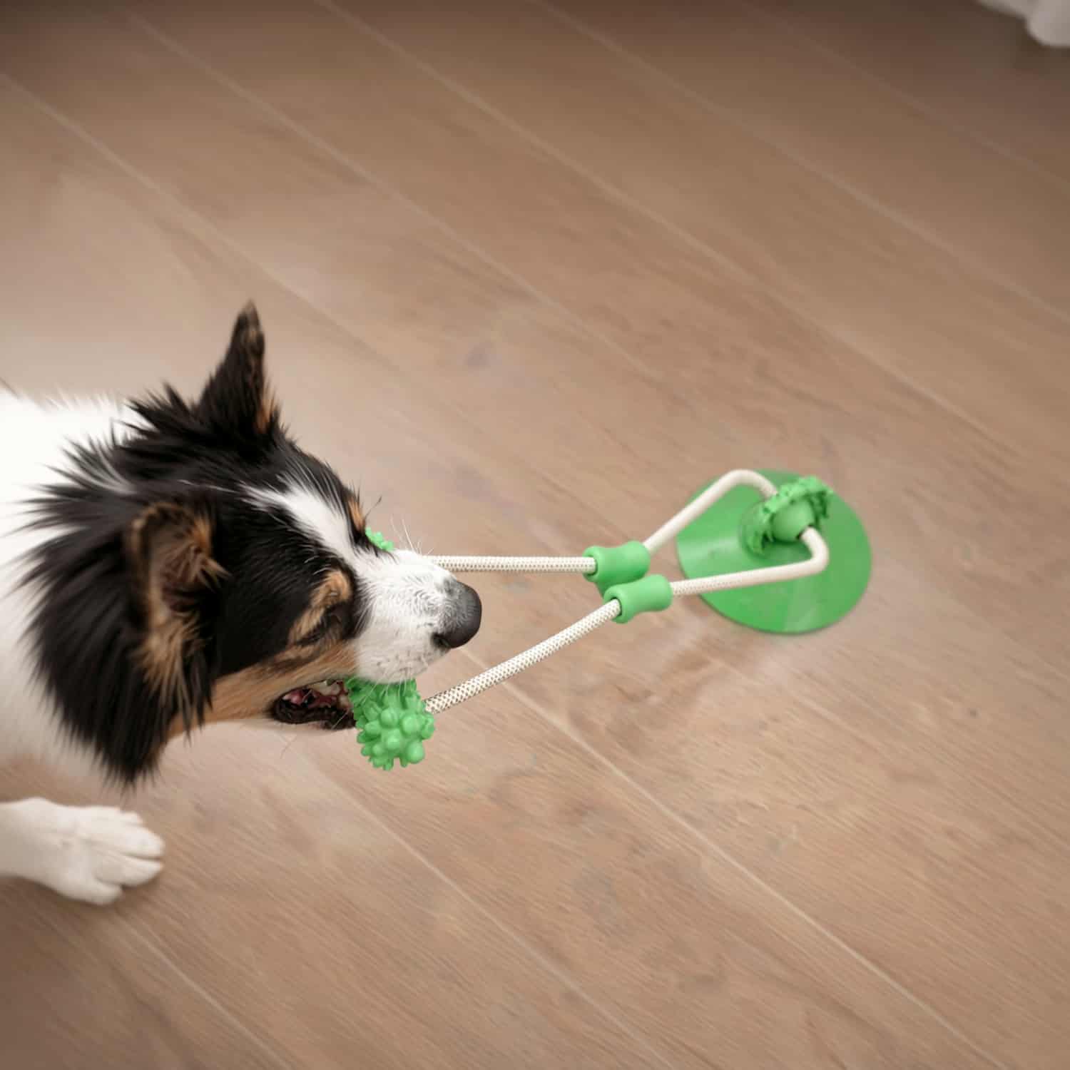 The only dog tug toy with a suction cup base that sticks to floors, letting dogs play tug-of-war without human help.