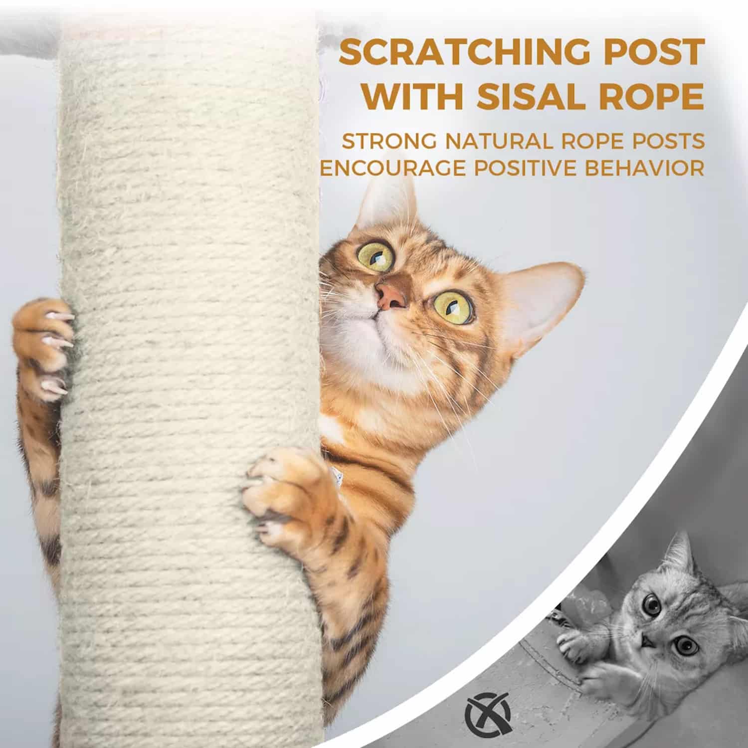 Natural sisal rope on support posts satisfies scratching instinct and protects furniture. Bottom risers feature grooming brushes that massage cats as they rub against them, removing loose fur. Dangling jingly ball toy encourages batting play. Multiple scratching surfaces accommodate several cats.