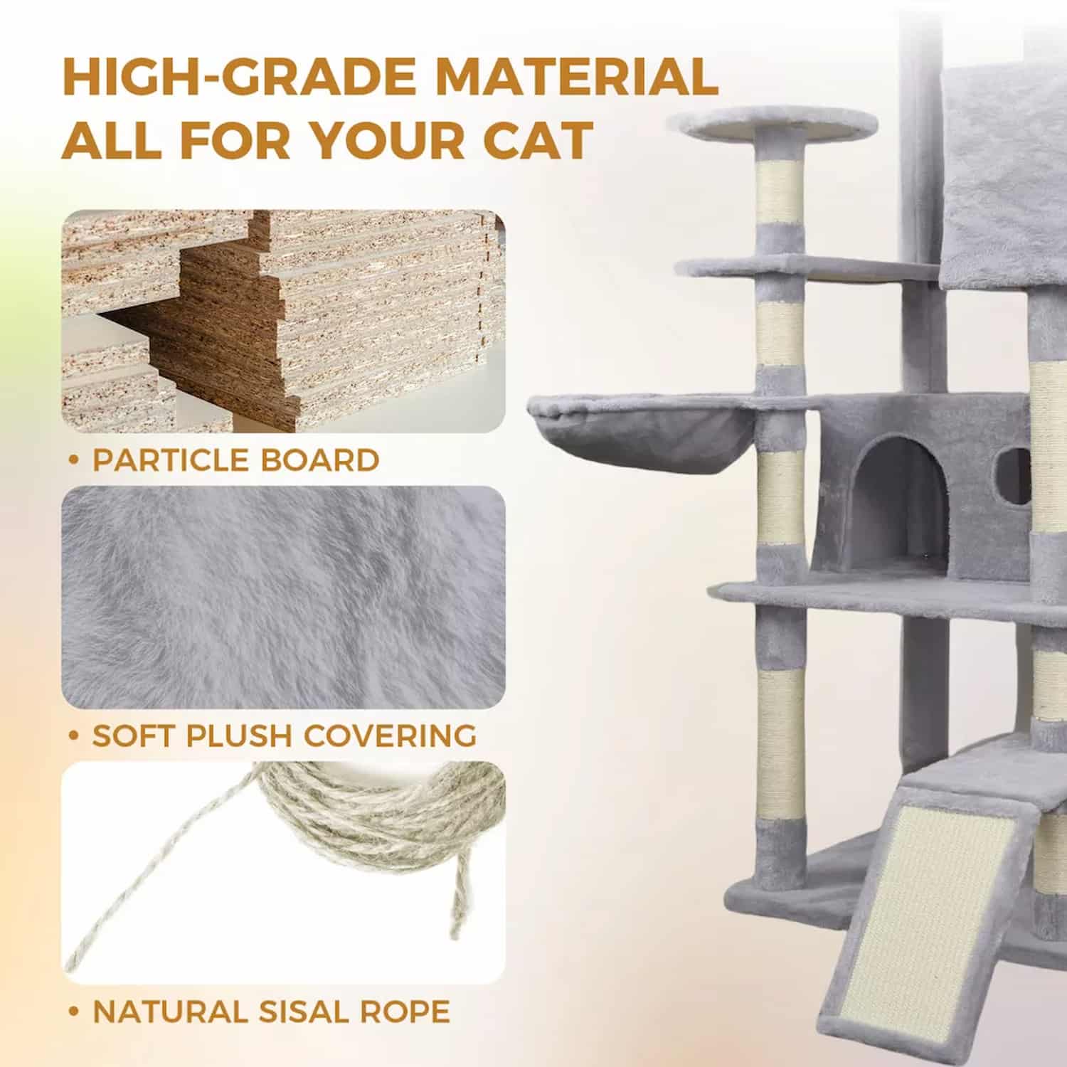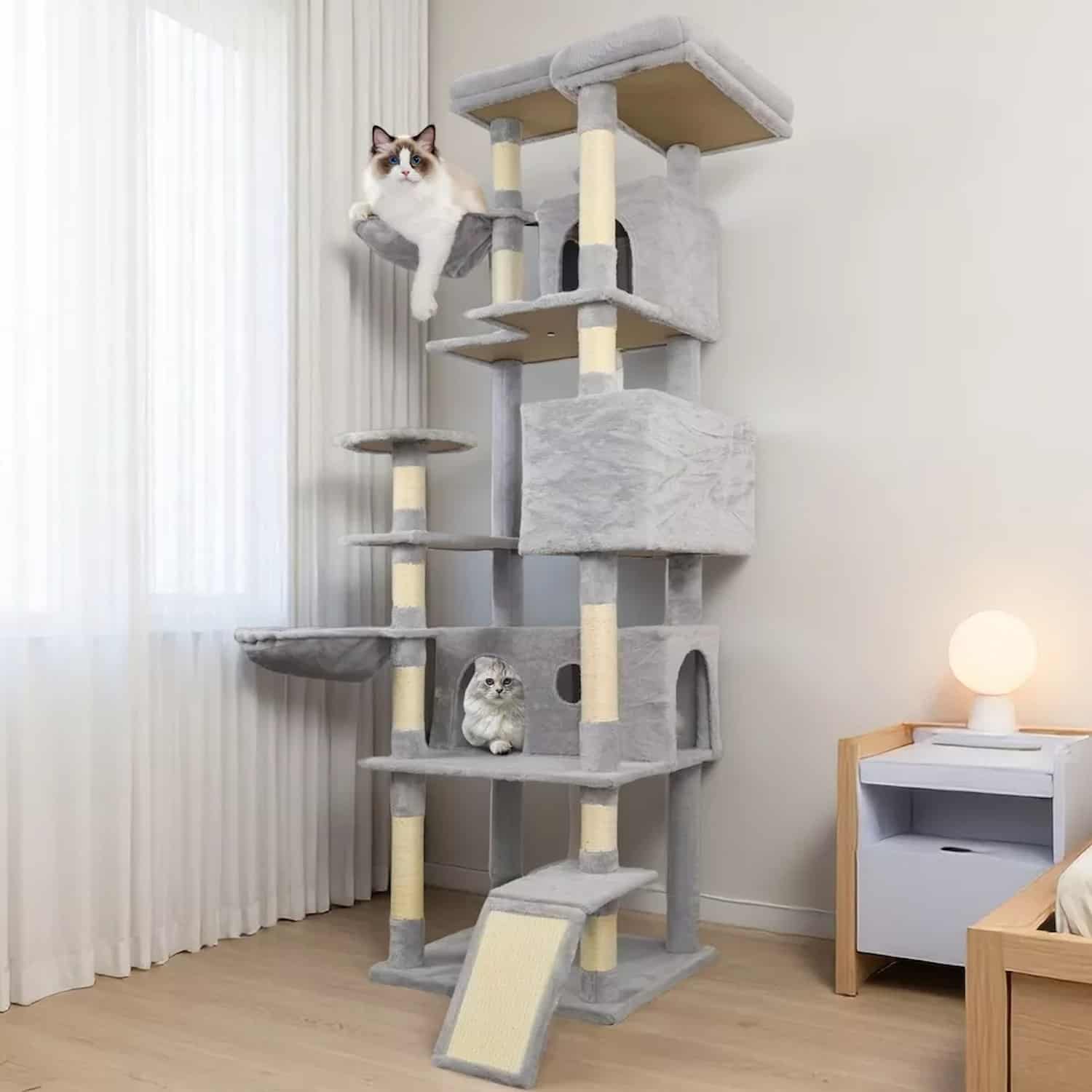 The only tall cat tower with a ground-level ramp that lets senior cats or kittens climb gradually instead of jumping between levels.