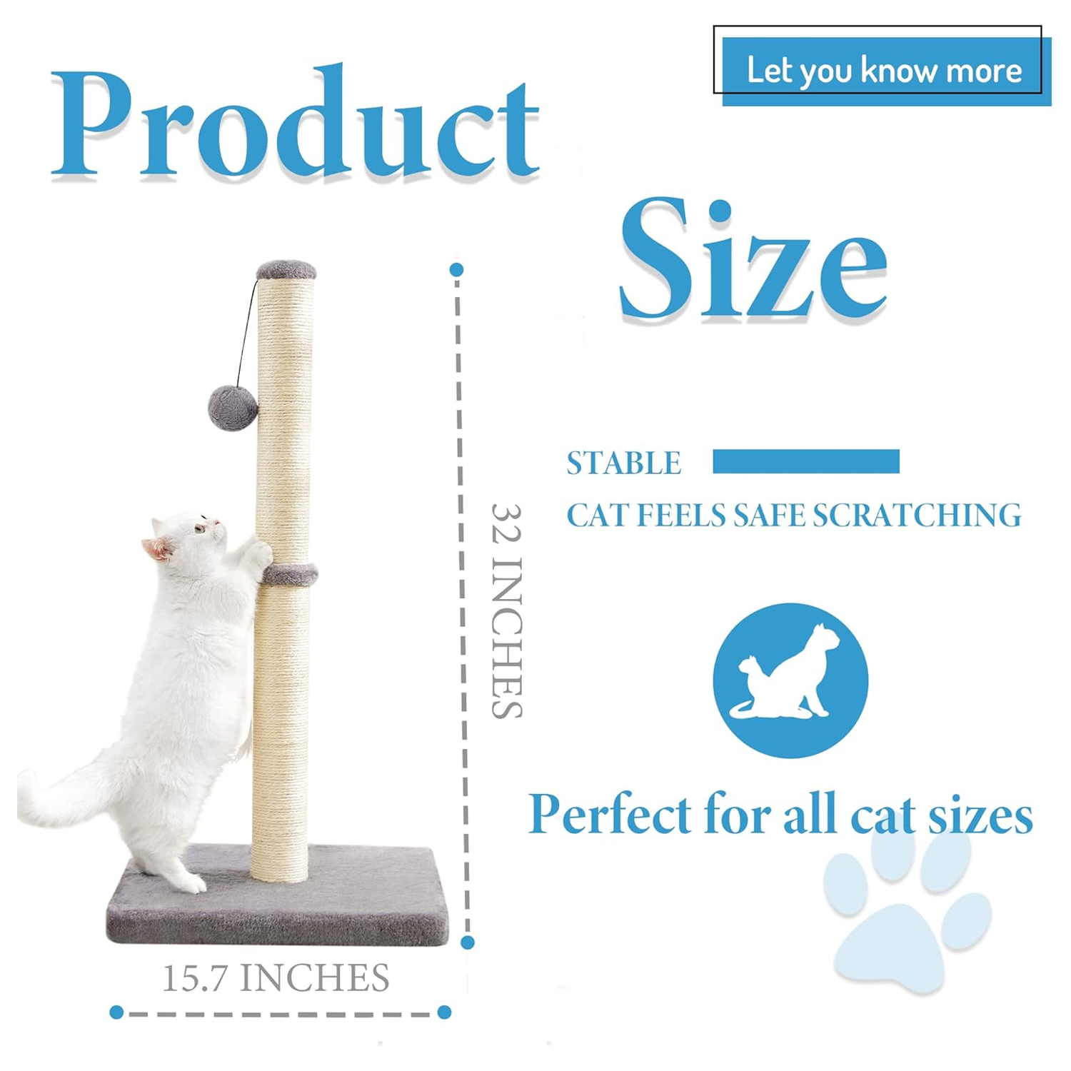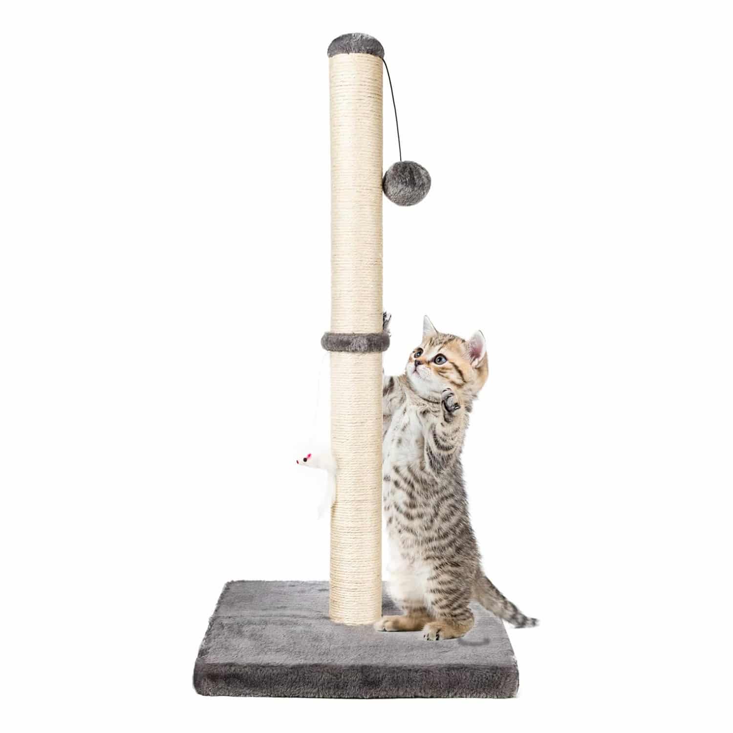 31-Inch Tall Sisal Cat Scratching Post, Hanging Ball, Plush Base, Full Stretch Height