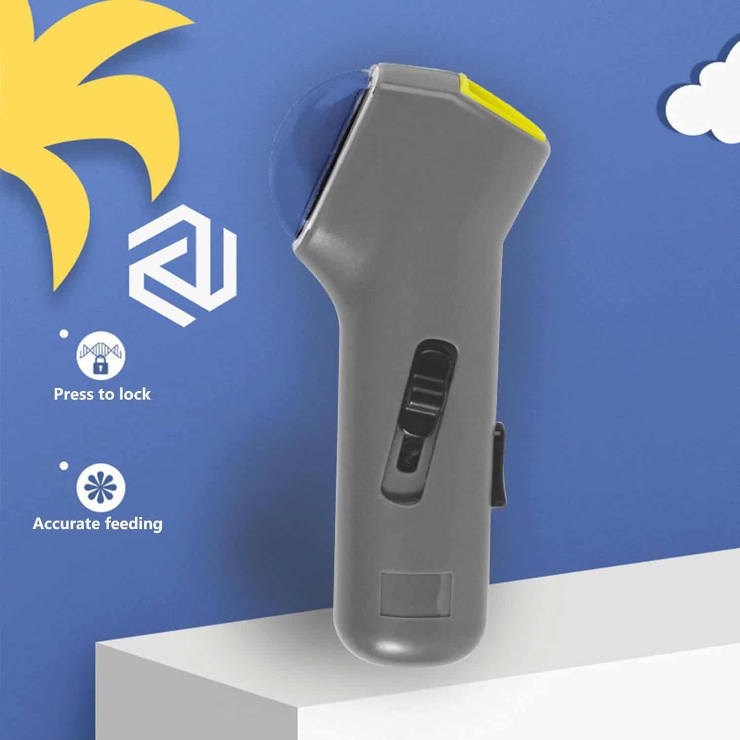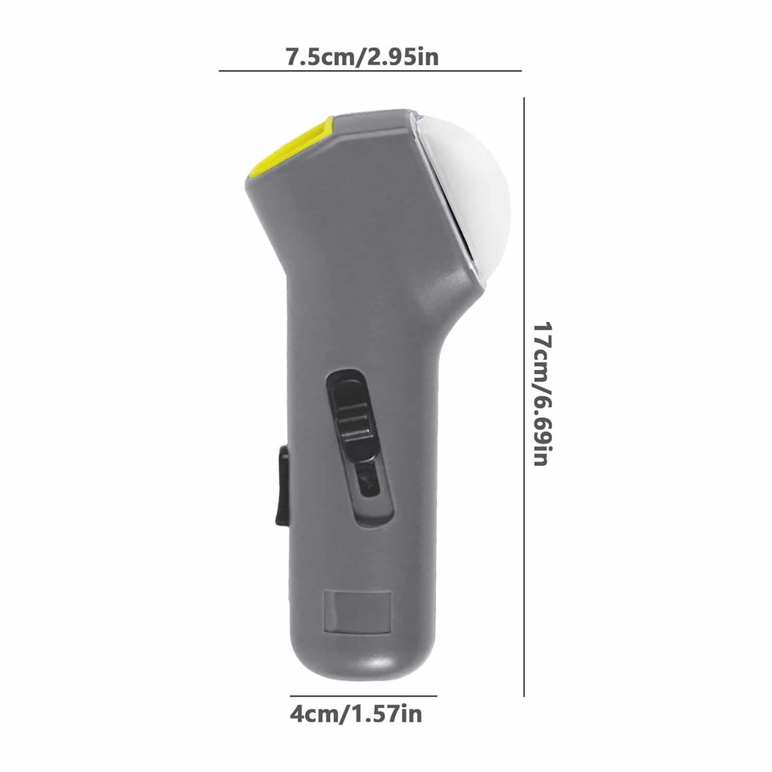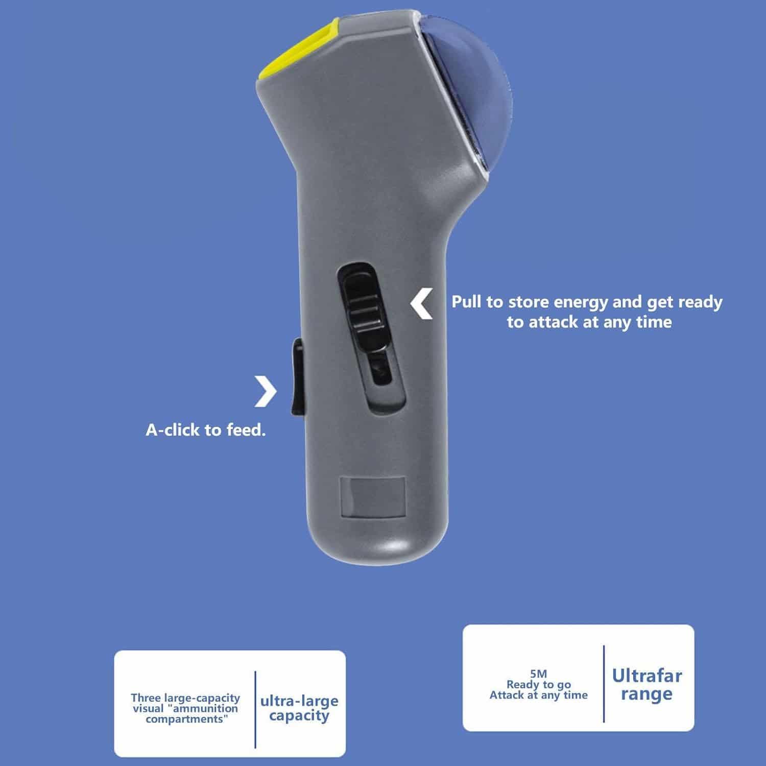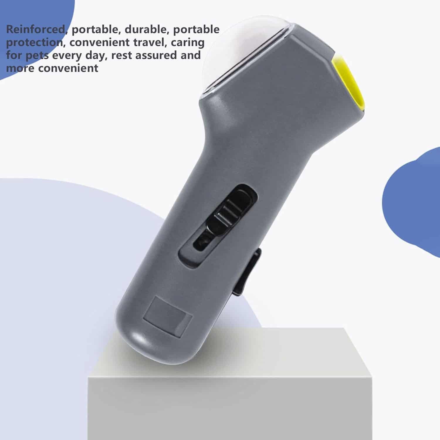 Handheld dog treat launcher with spring-loaded mechanism fires treats up to 15 feet. Side storage chamber holds 30+ small treats. Ergonomic grip for one-handed loading and firing. Flip-top lid for easy refilling and cleaning. 7 inches tall, 3 inches wide. PP plastic construction. Works with kibble-sized treats and training snacks. Available in gray.