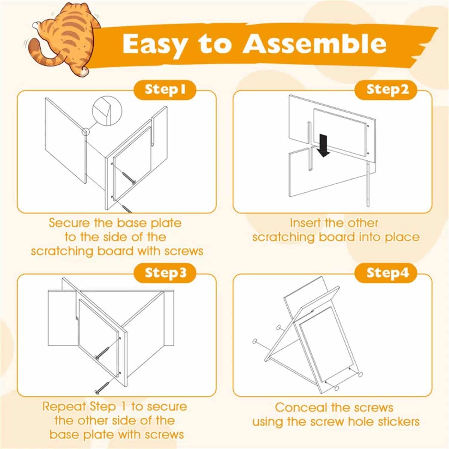 Engineered wood frame distributes weight evenly through three-point base, preventing tipping during vigorous use. Wide stance (18.5"L x 12"W) handles jumping cats without wobbling. Slot-in assembly connects without tools. Adhesive screw covers conceal all joints for clean finish.