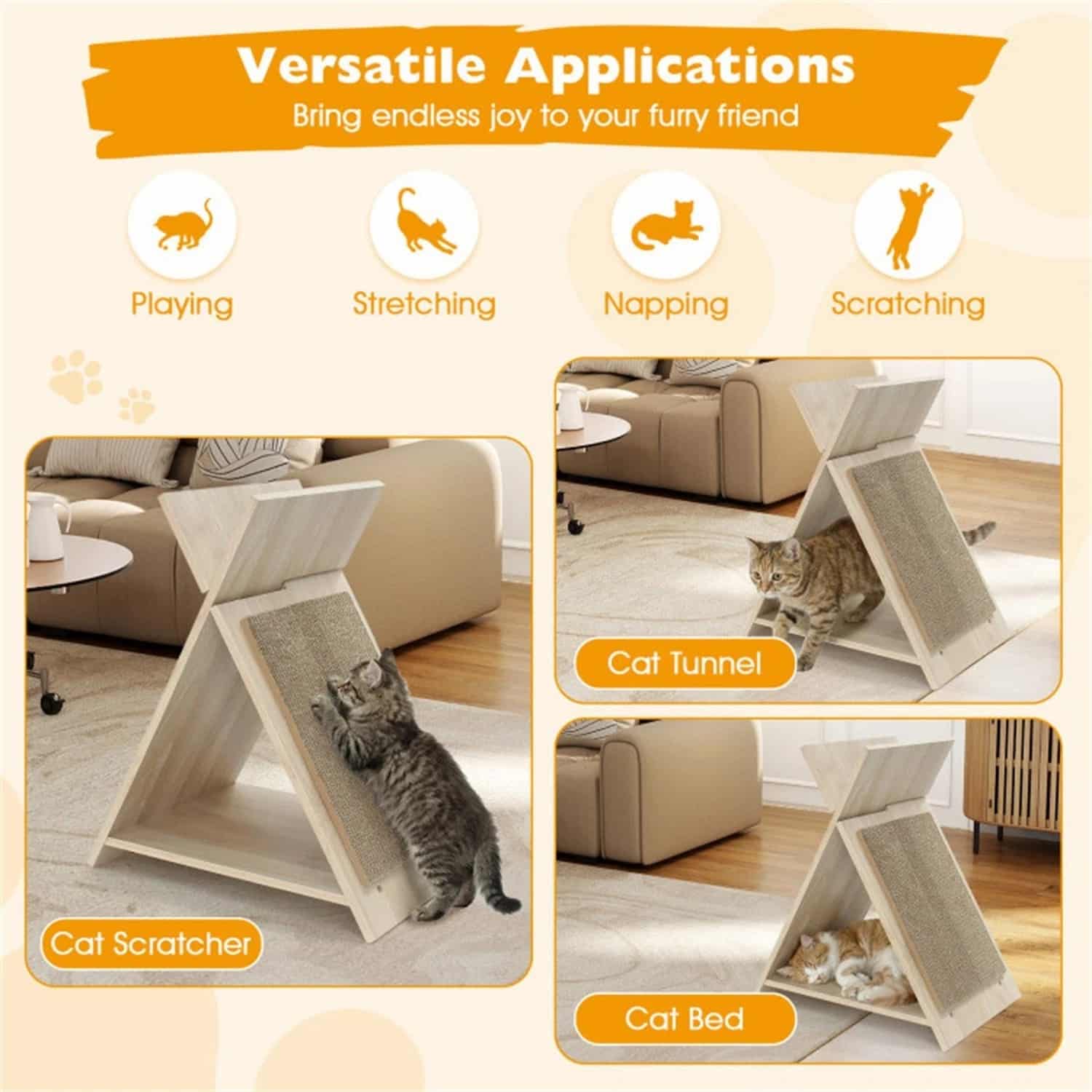 The only cat scratcher with a triangular wooden frame that creates an enclosed lounge underneath while the corrugated surface above handles scratching.