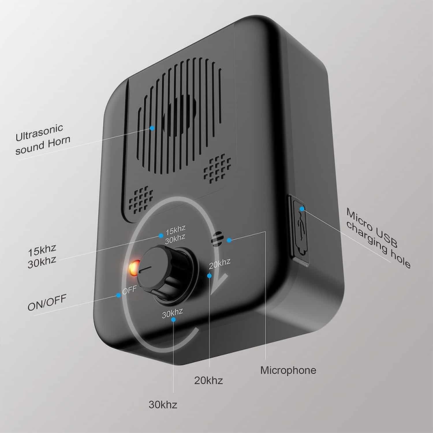 Dial between variable frequency (15 to 30 kHz), fixed 20 kHz, fixed 30 kHz, or off. Different dogs respond to different frequencies, so you cycle through modes until you find the one that works. Variable mode sweeps the full range automatically, covering the widest variety of breeds in one setting.