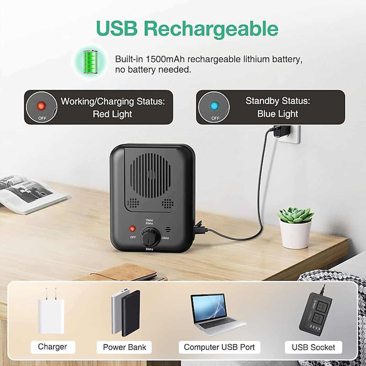 Ultrasonic bark control device with 4 adjustable frequency modes (variable 15 to 30 kHz, fixed 20 kHz, fixed 30 kHz, and off) that interrupts barking from up to 33 ft away. Built in 1500mAh rechargeable lithium battery charges via USB in 5 hours and holds 30 days of standby. IPX4 waterproof for outdoor mounting on fences, porches, or trees. Includes wall screws, anchors, hanging rope, dog whistle, and USB cable. Harmless ultrasonic frequency, no collar or contact required. Allow up to 2 weeks for training. Does not work on deaf or hard of hearing dogs.