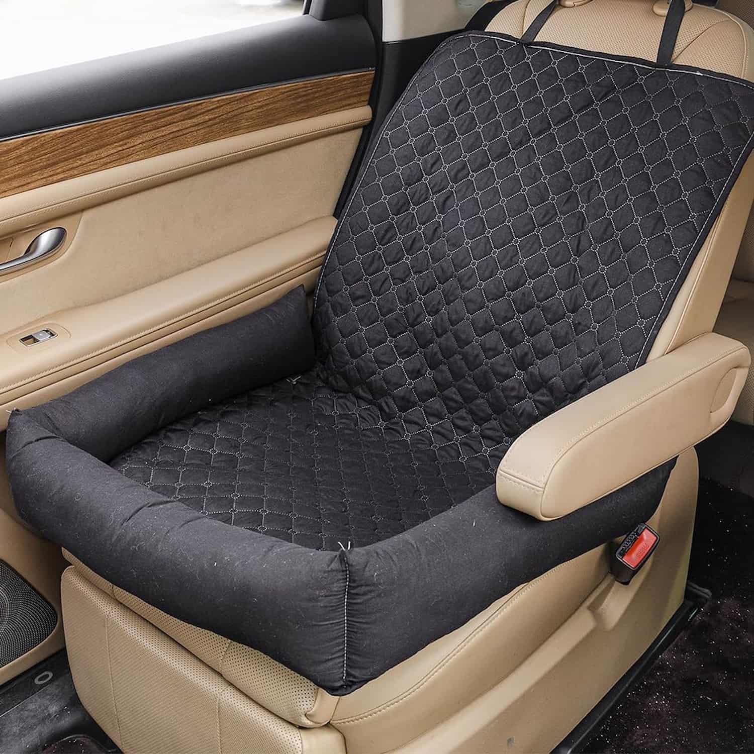 The only car seat pet mat with a rubber non-slip base and raised bolster sides, keeping the mat anchored through sharp turns while the walls prevent pets from sliding off the seat.
